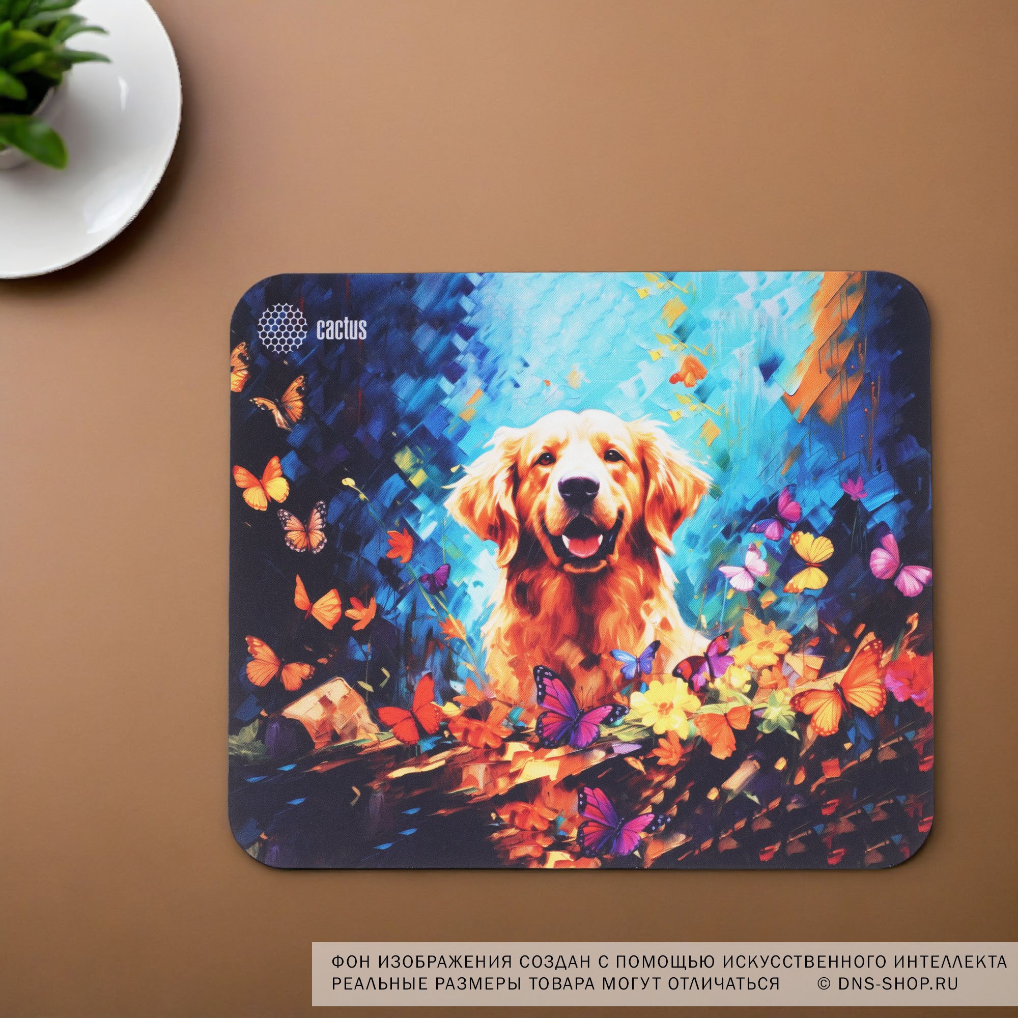 Коврик Cactus Dog разноцветный с изображением собаки маленького размера 300/250/3 мм обеспечивает точность и устойчивость движений мышки, устраняет дрожание курсора и предотвращает рывки. Подставка защищает нижнюю часть мыши от попадания внутрь устройства пыли и мелкого мусора.