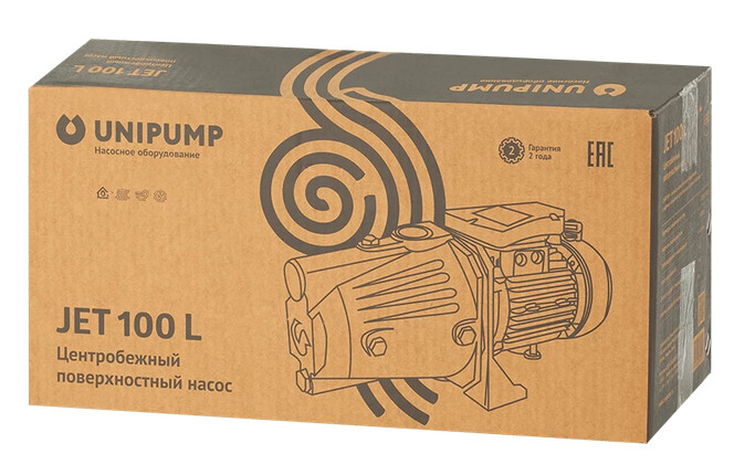 UNIPUMP JET 100L - однофазный одноступенчатый центробежный поверхностный насос с удлиненным эжектором, чугунным корпусом, рабочим колесом из латуни, медной обмоткой статора для подачи чистой холодной воды из скважин и колодцев (глубиной не более 8 метров), открытых водоемов, резервуаров и других источников водоснабжения.
