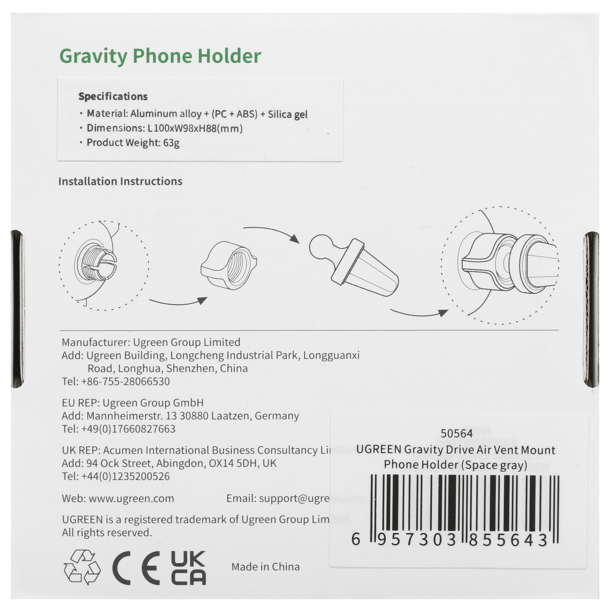 Держатель автомобильный Ugreen LP130 устанавливается на вентиляционную решетку с помощью зажима, который надежно удерживает телефон даже во время езды по бездорожью. Корпус изготовлен из металла и пластика, что делает его долговечным и износостойким. Модель имеет гравитационный режим, что обеспечивает комфортные и безопасные условия и эксплуатации. Приспособление вращается на 360°, поэтому смартфон можно зафиксировать в любом удобном положении.