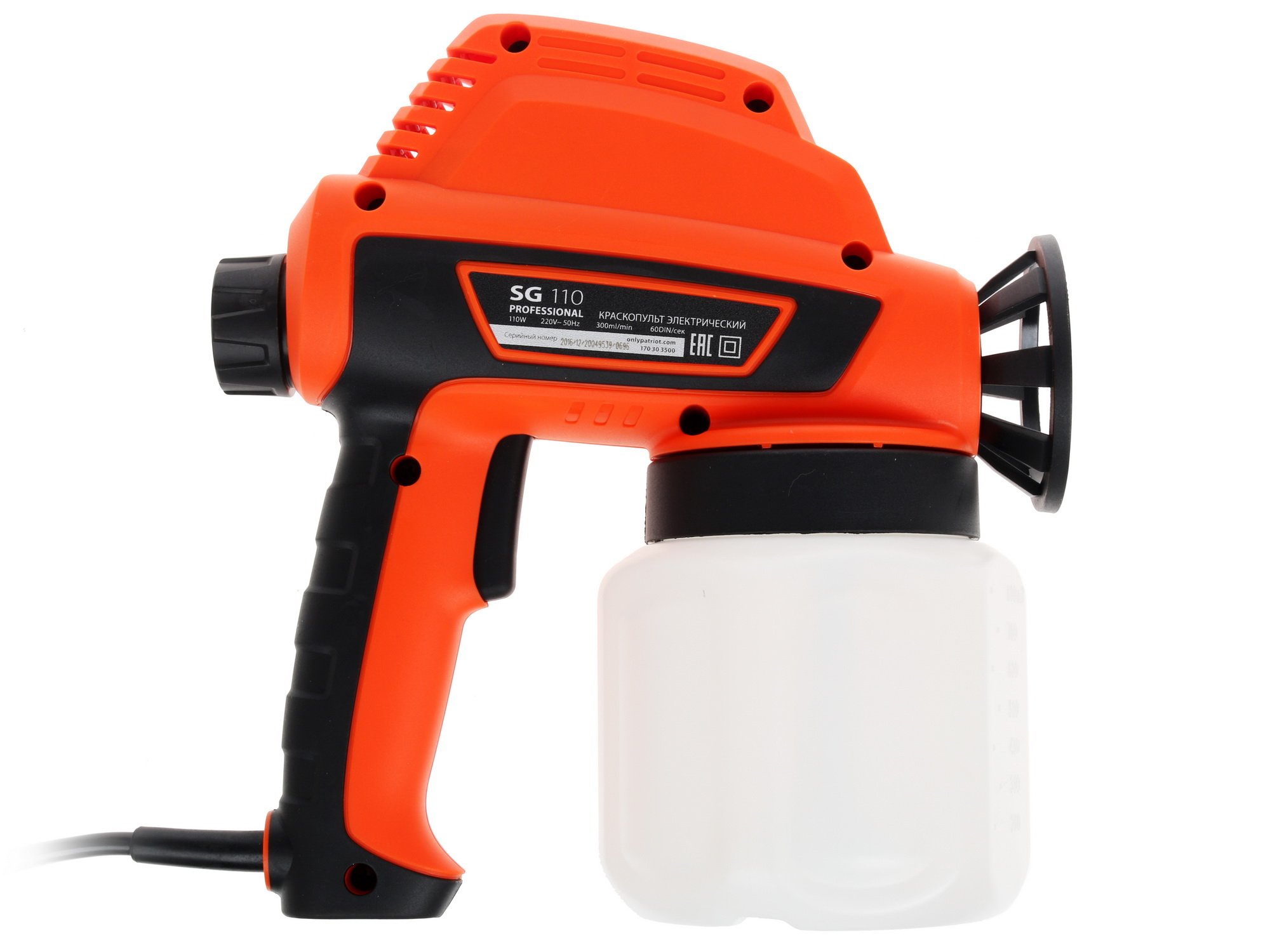 Краскораспылитель Patriot SG110 - электрический прибор ручного типа, при помощи которого вы сможете достаточно быстро окрасить стены помещения в нужный вам цвет. Представленная модель обладает невысокой мощностью энергопотребления, составляющей 110 Вт, при этом ее производительность порадует даже профессиональных ремонтников - 300 г/мин. Емкость бака для краски или иной жидкости составляет 800 мл, такого объема вам хватит на долгий срок работы с устройством. Корпус бака выполнен из прочного и качественного пластика, который не разрушится вследствие контакта с ним красящих веществ.
