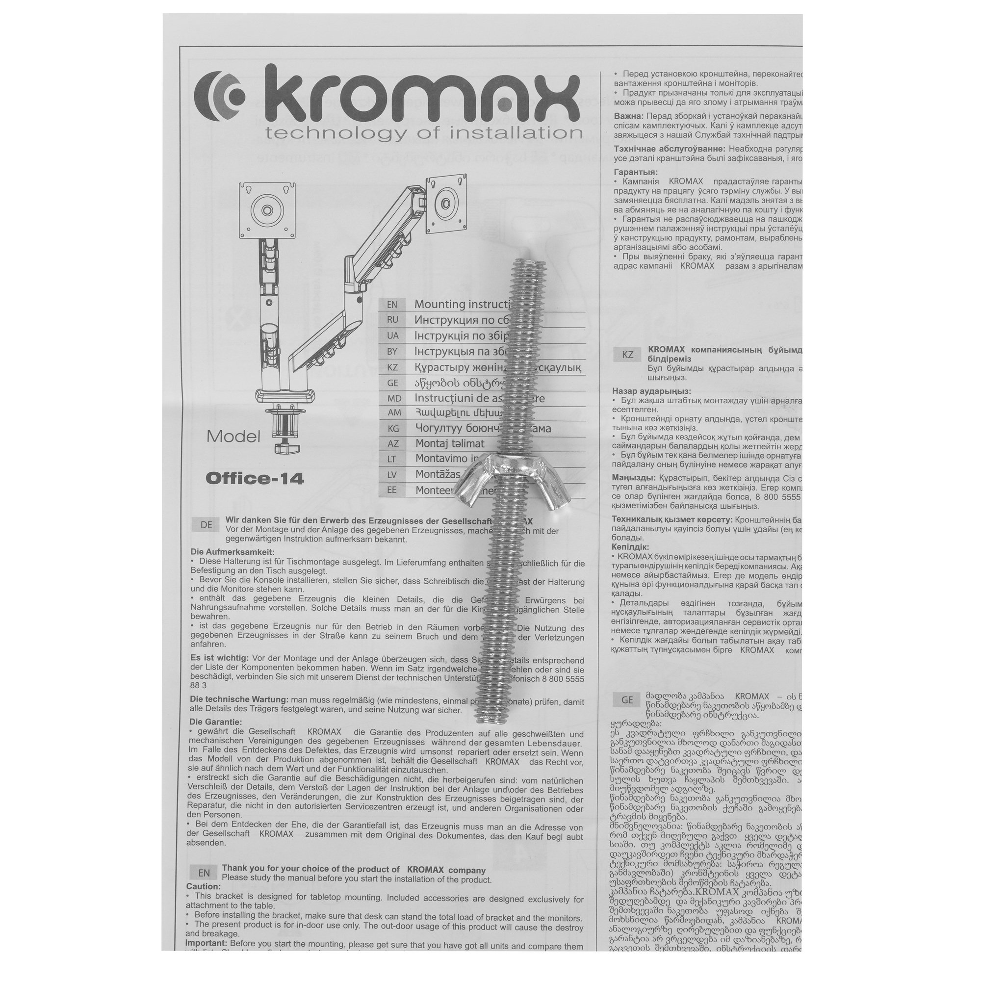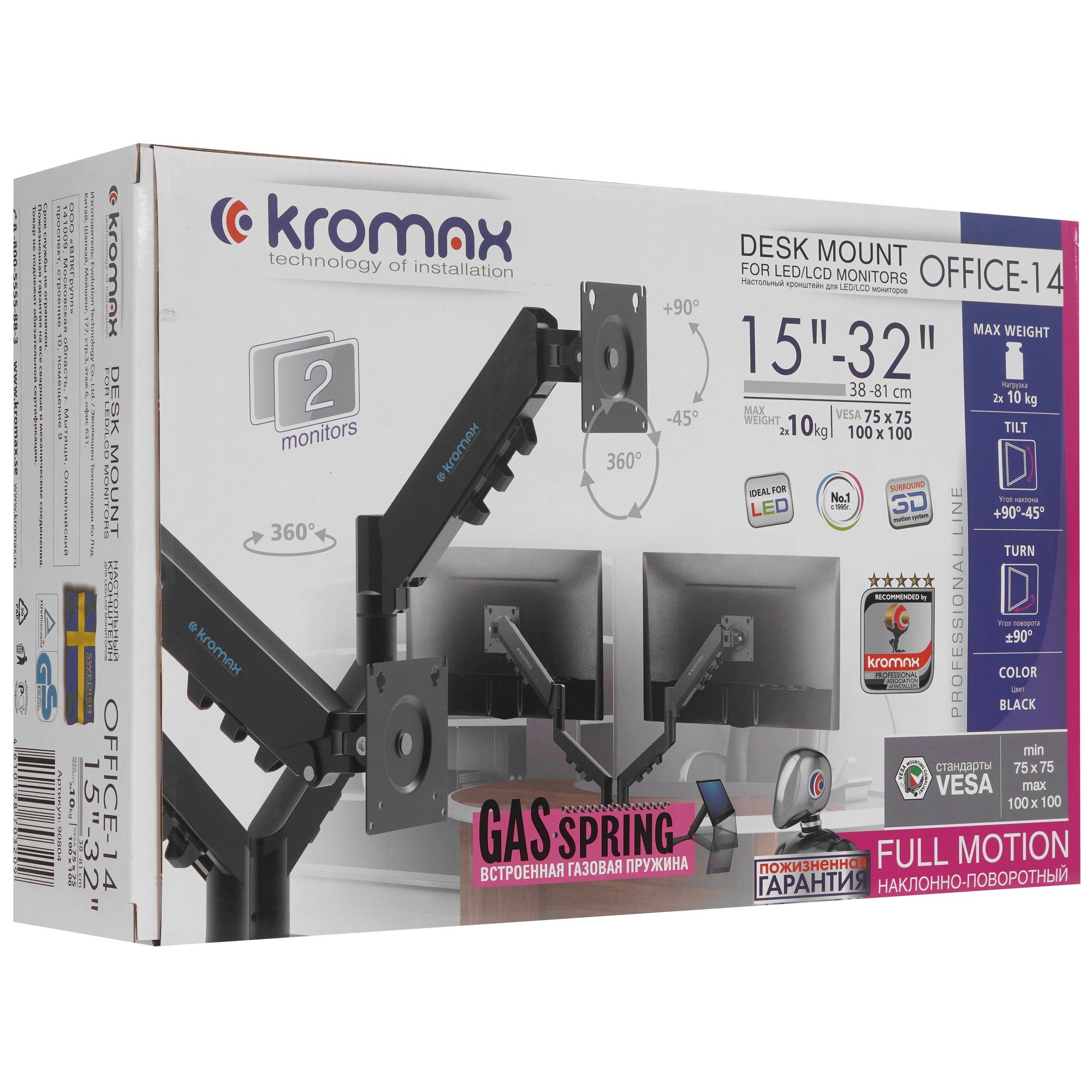 KROMAX OFFICE-14 BLACK имеет настольный тип установки с механизмом защиты от падения. Крепёжные отверстия настольного кронштейна KROMAX OFFICE-14 BLACK изготовлены по международному стандарту VESA. Кронштейн подходит для большинства мониторов популярных брендов, среди которых Samsung, LG, Sony, Panasonic, Sharp, Toshiba, Dell, ASUS, HP, Acer, BenQ, MSI, Philips, Lenovo, Sceptre, ViewSonic, Gigabyte, AOC, Viotek и других.