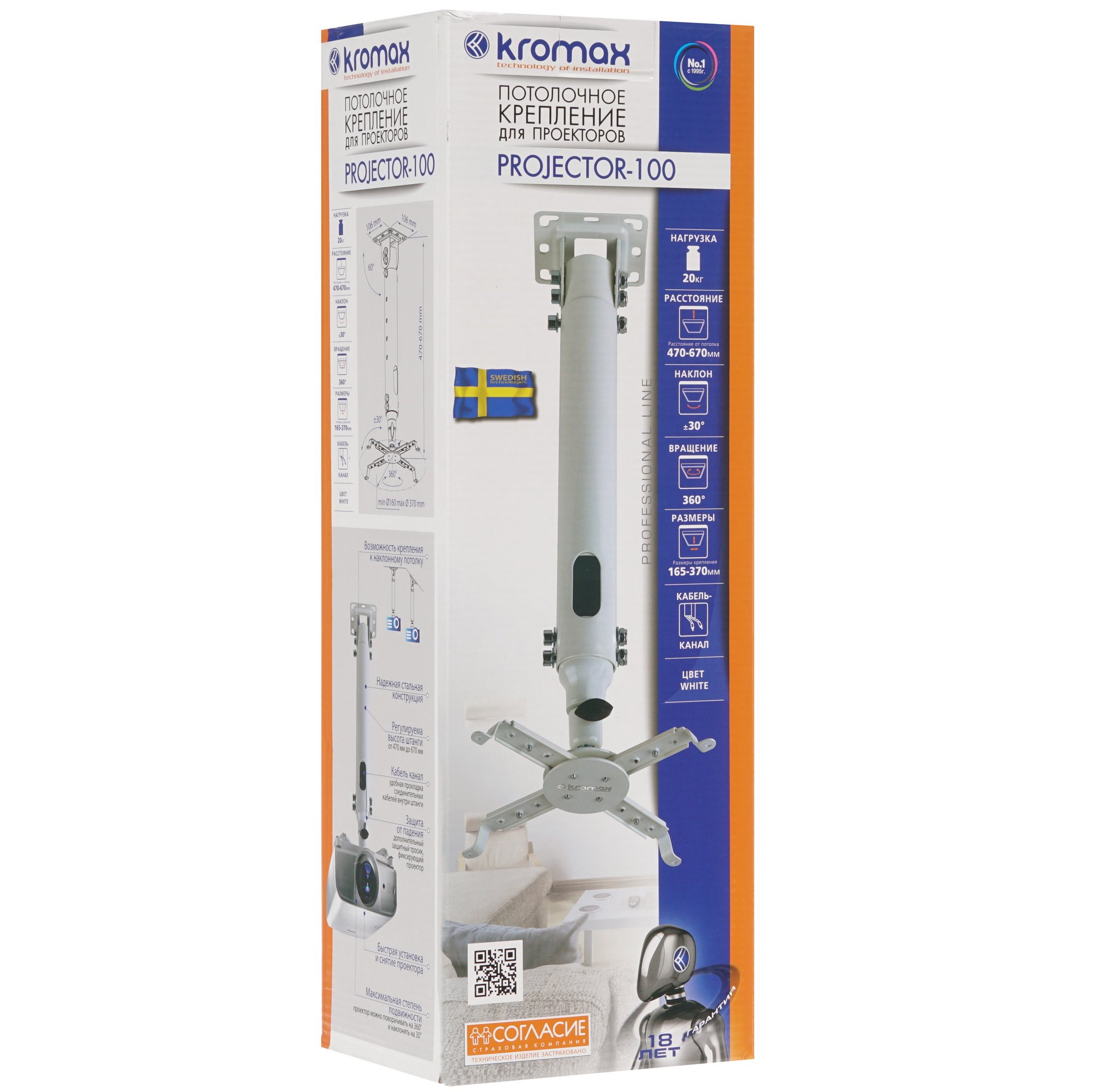 Крепление потолочное Kromax PROJECTOR-100 белый для проектора, 3 ст свободы, наклон 30°, вращение на 360°, от потолка 470-670 мм, нагрузка до 20 кг