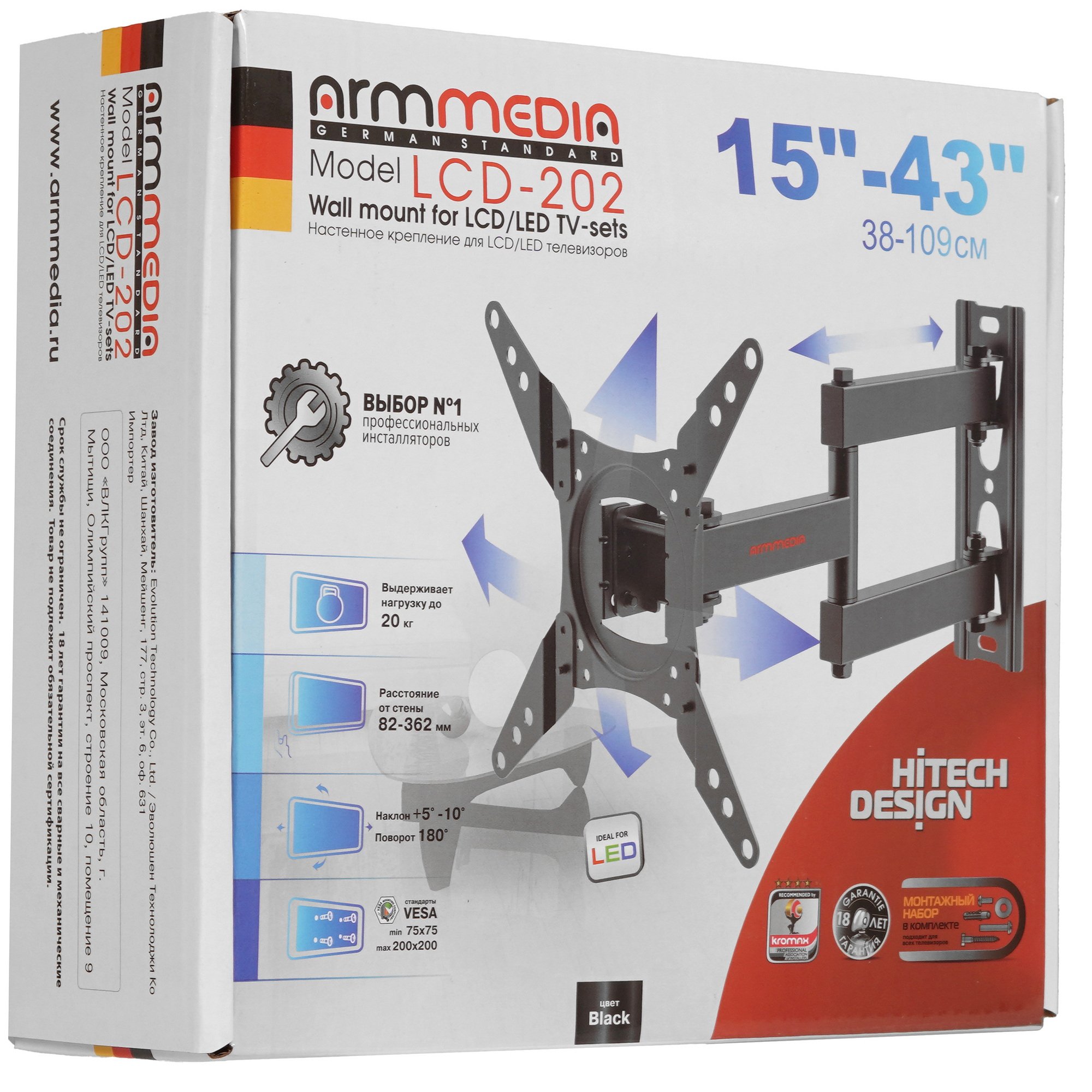 Кронштейн ARM MEDIA LCD-202 плотно фиксируется на поверхности и имеет минимальное расстояние от стены 89 мм. Он выдерживает нагрузку до 20 кг. Конструкция из металла с покрытием черного цвета гарантирует устойчивость к деформации и механическим воздействиям.