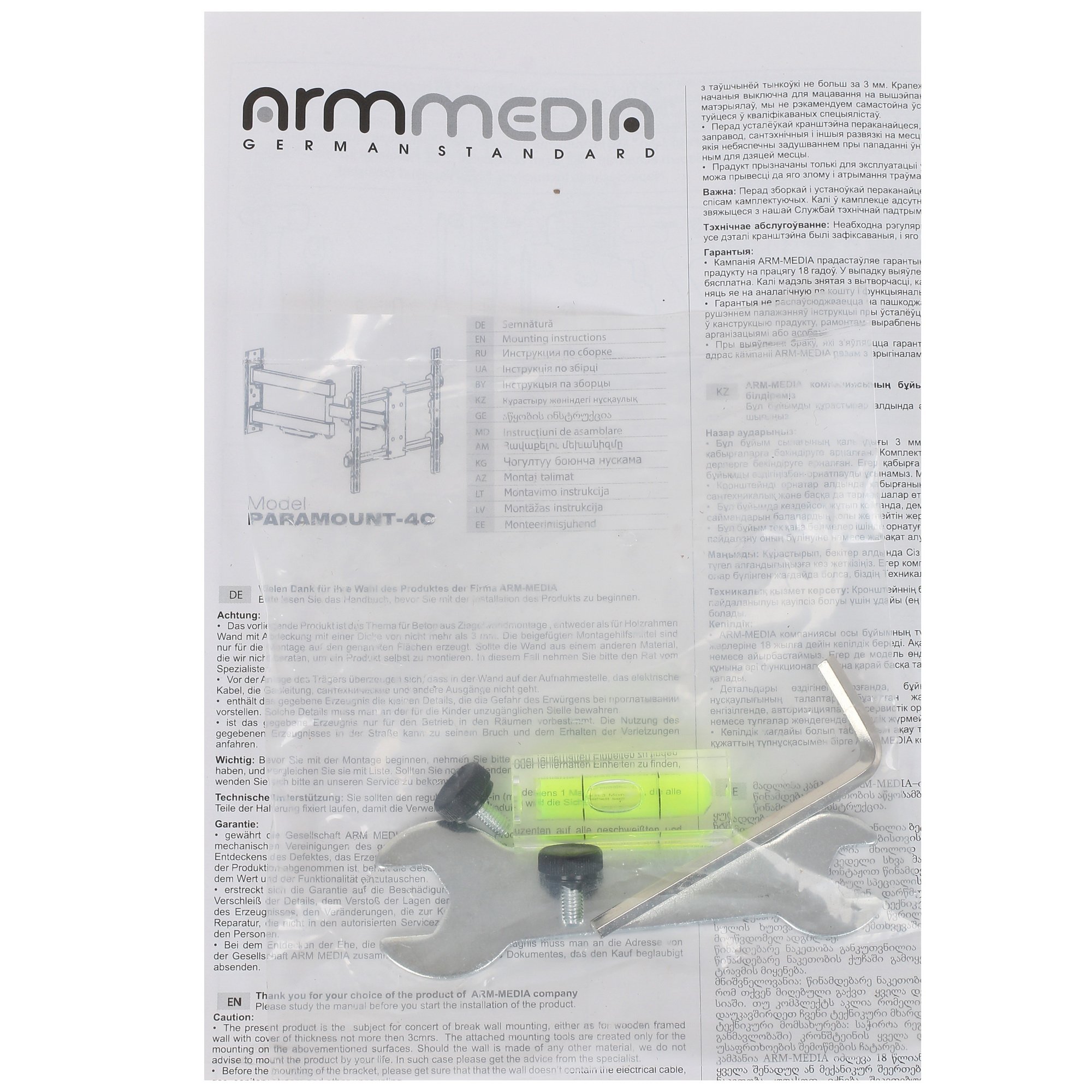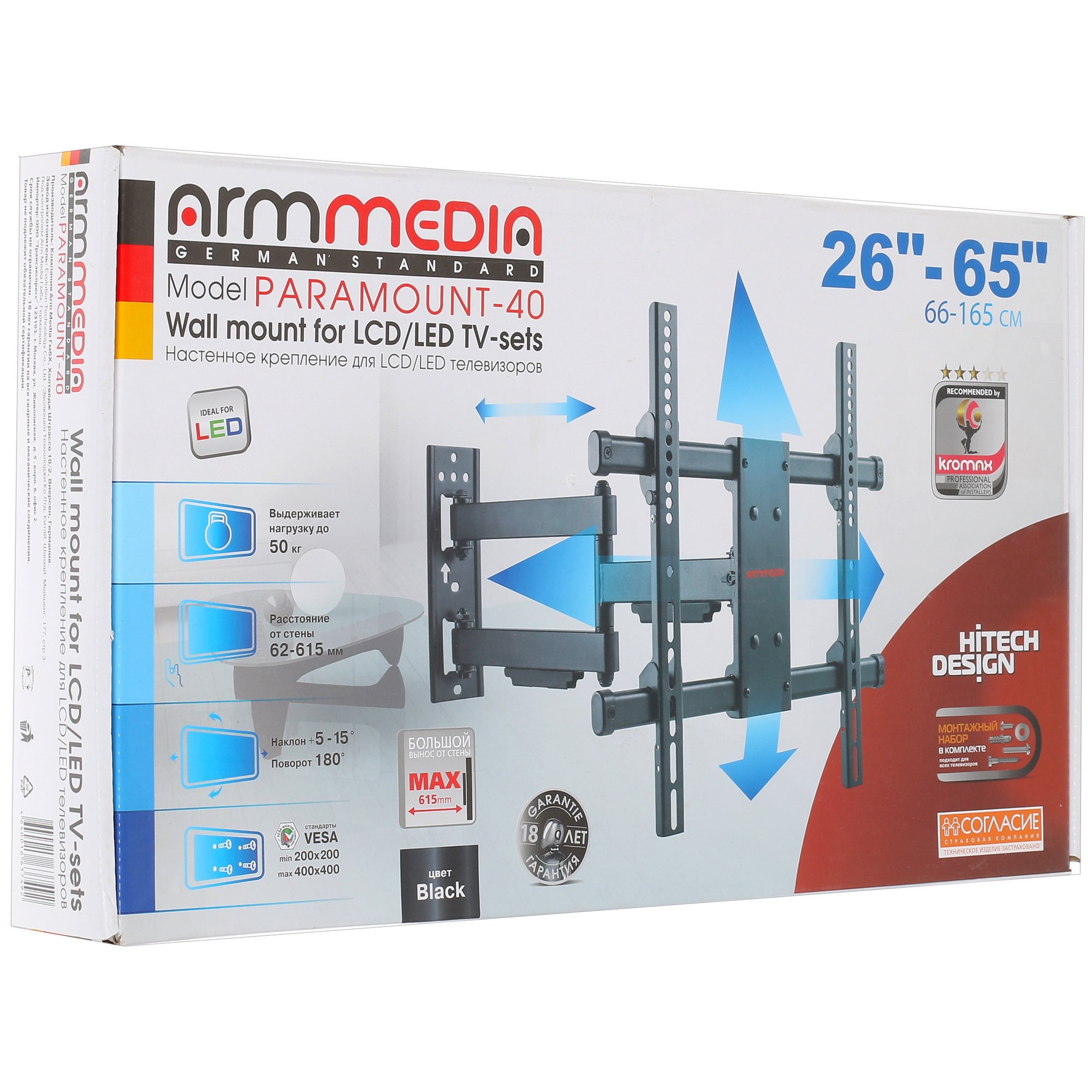 Кронштейн для ТВ Arm media PARAMOUNT-40 имеет насколько сложную, настолько и эффективную конструкцию. Модель, поддерживающая стандарты VESA от 100x100 до 400x400, позволяет максимально точно настроить положение телевизора в пространстве. Есть возможность поворота на 180°. Расстояние телеприемника от стены может изменяться в пределах от 62 до 615 мм. Максимальный угол наклона вверх – 3°, а максимальный угол наклона вниз – 10°.