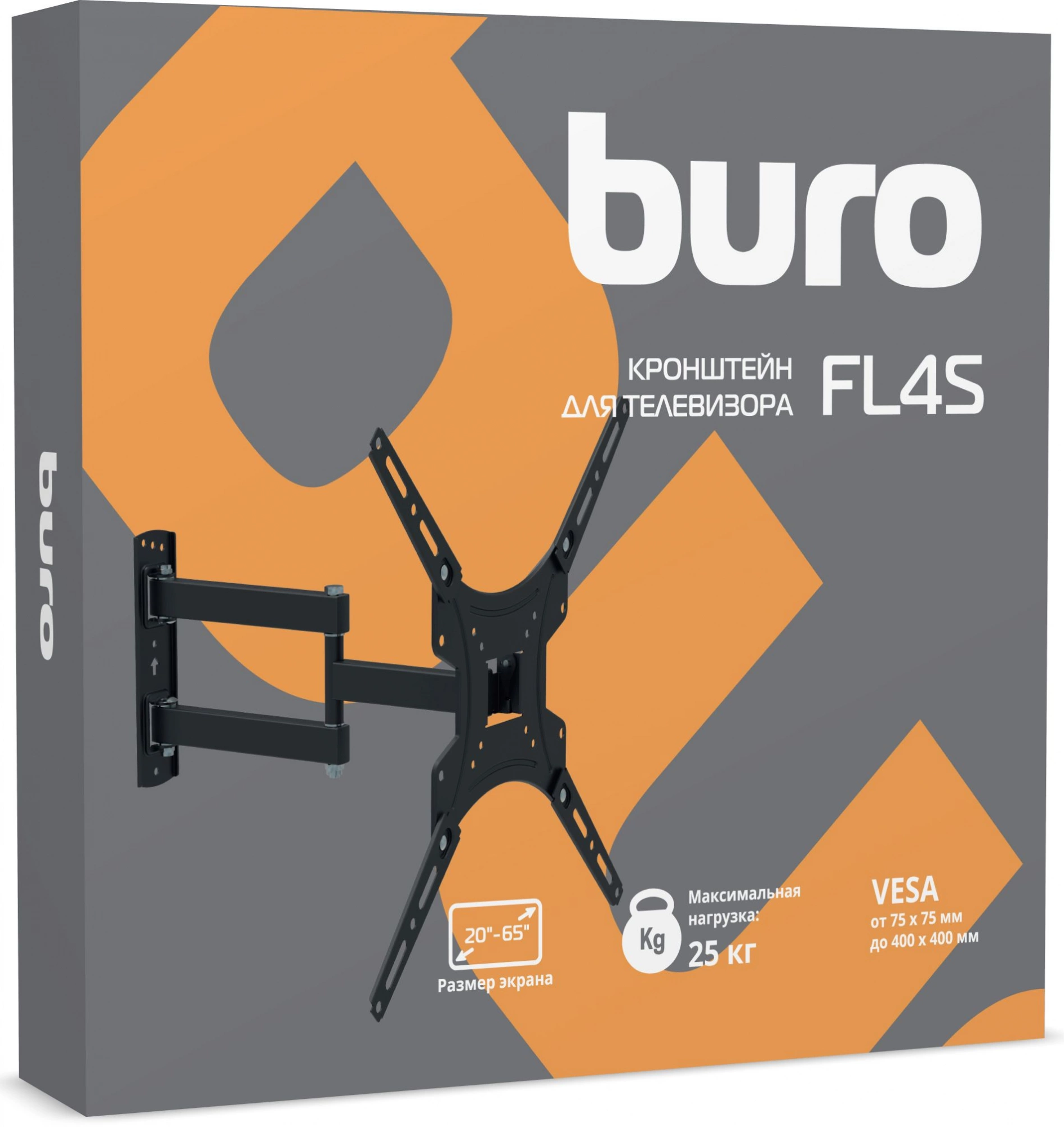 Кронштейн для ТВ Buro FL4S предусматривает настройку положения просмотра за счет регулировки угла наклона вперед/назад и поворота до 180°. Он предназначен для использования с телевизорами диагональю экрана от 20 до 65 дюймов. Монтажная пластина с отверстиями делает удобным процесс установки.