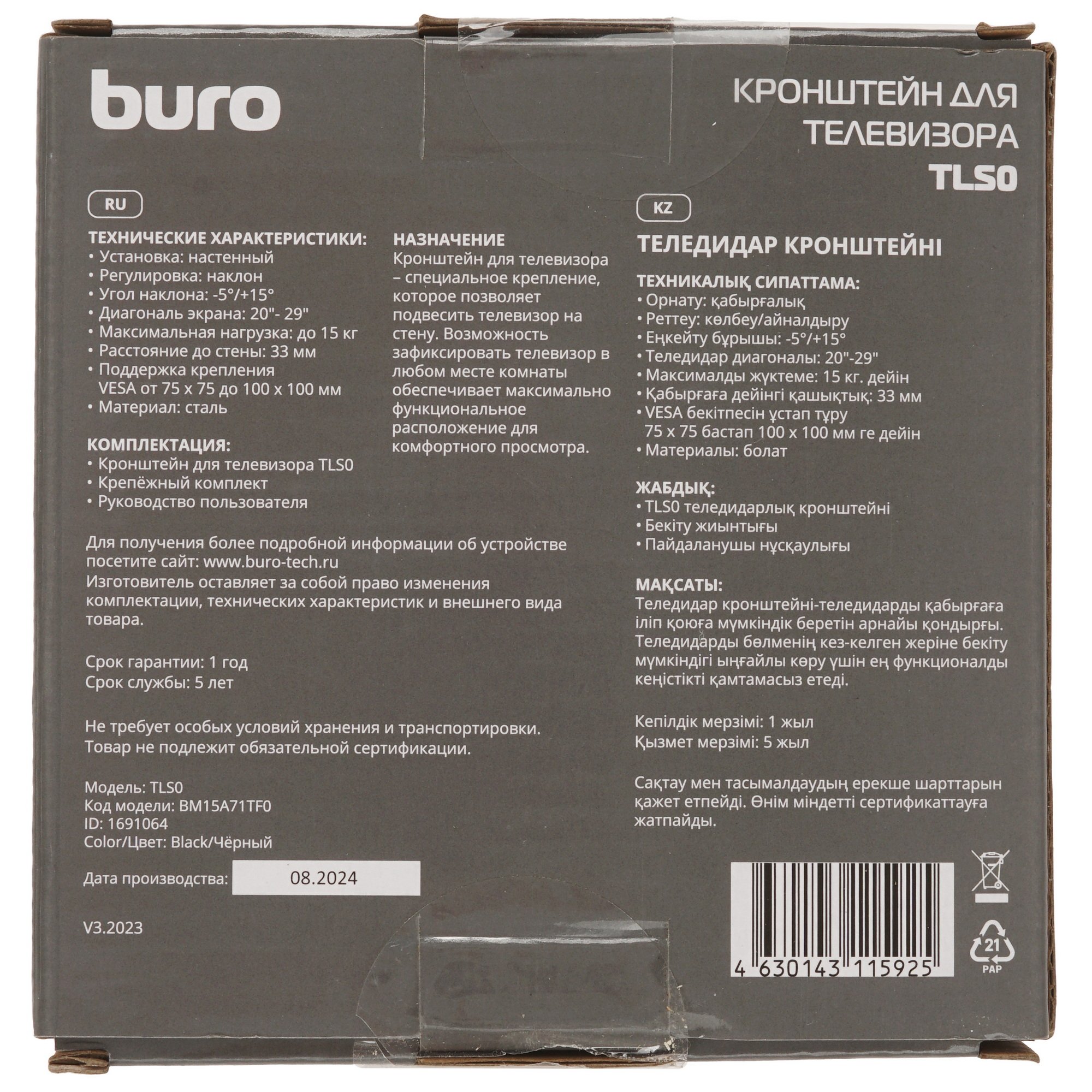 Кронштейн Buro TLS0 плотно фиксируется на поверхности с расстоянием от стены 33 мм. Он выдерживает нагрузку до 15 кг. Конструкция из металла с окрашенным покрытием черного цвета гарантирует устойчивость к деформации и механическим воздействиям.