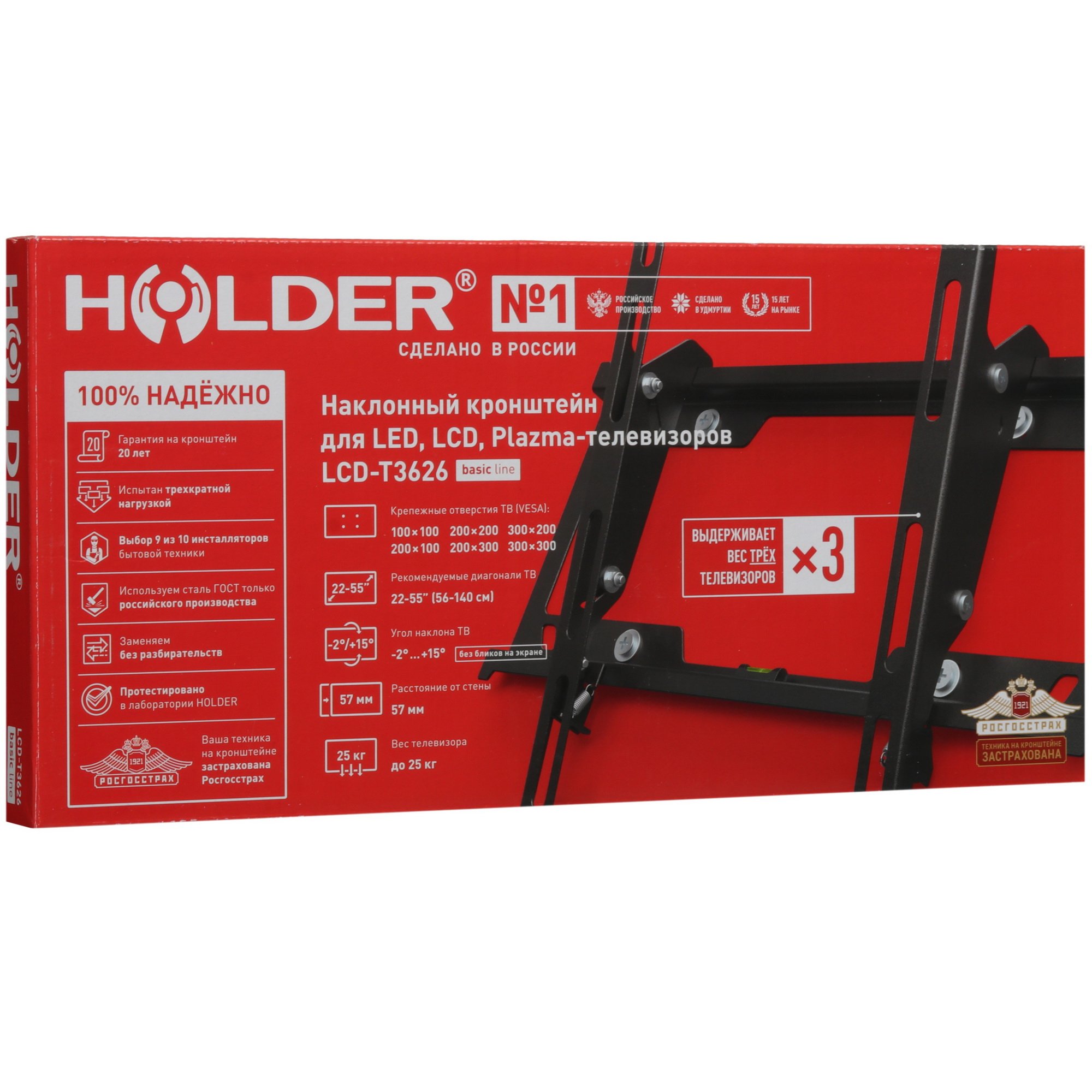 Кронштейн для ТВ Holder LCD-T3626-B в черном цвете служит для крепления телевизоров. Он поддерживает экраны от 22" до 55" и может выдерживать нагрузку до 25 кг. Устройство имеет стандарт размеров крепления VESA до 300 х 300. Holder LCD-T3626-B имеет расстояние от стены 57 мм. Модель имеет угол наклона до 2° вверх и до 15° вниз, что позволяет подстроить экран под нужный для просмотра угол.