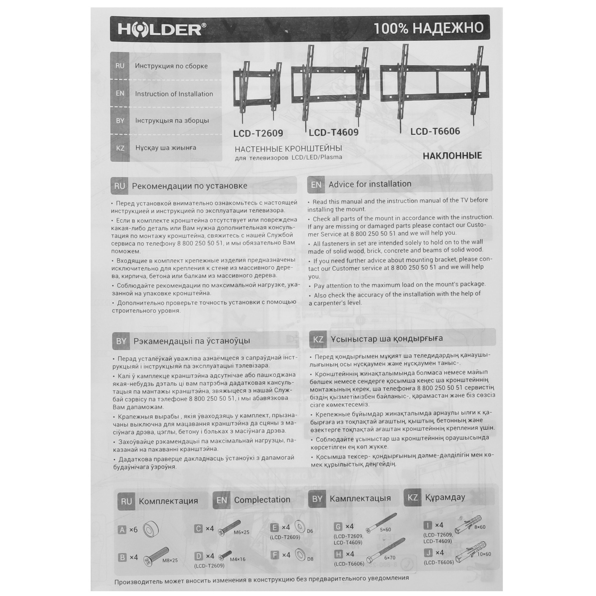 Кронштейн выполнен из прочной 2-миллиметровой стали, обеспечивающей надежность конструкции. Зафиксированный в крепление телевизор или монитор будет находиться на расстоянии 60 мм от стены. Конструкция крепления Holder LCD-T6606-B может наклоняться под углом вверх и вниз (от +2° до -15°) вручную. Эта опция обеспечит удобный обзор практически с любого ракурса.
