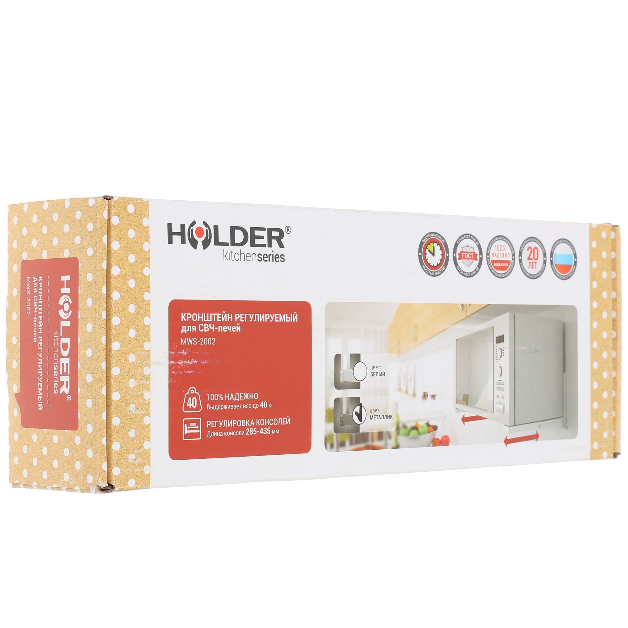 Крепления фирмы Holder, одного из самых старых поставщиков крепежных приспособлений на российском рынке, обладают высокой надежностью на протяжении всего срока эксплуатации. Holder MWS-2002 — комплект в который входят две консоли окрашенные в серебристый цвет. За счет крепления на трех винтах достигается высокая степень прилегания консоли к стене. Раздвижной механизм обеспечивает возможность применения консолей с бытовой техникой любых габаритов.