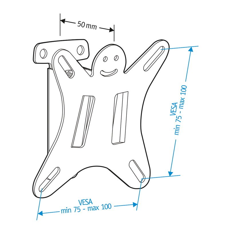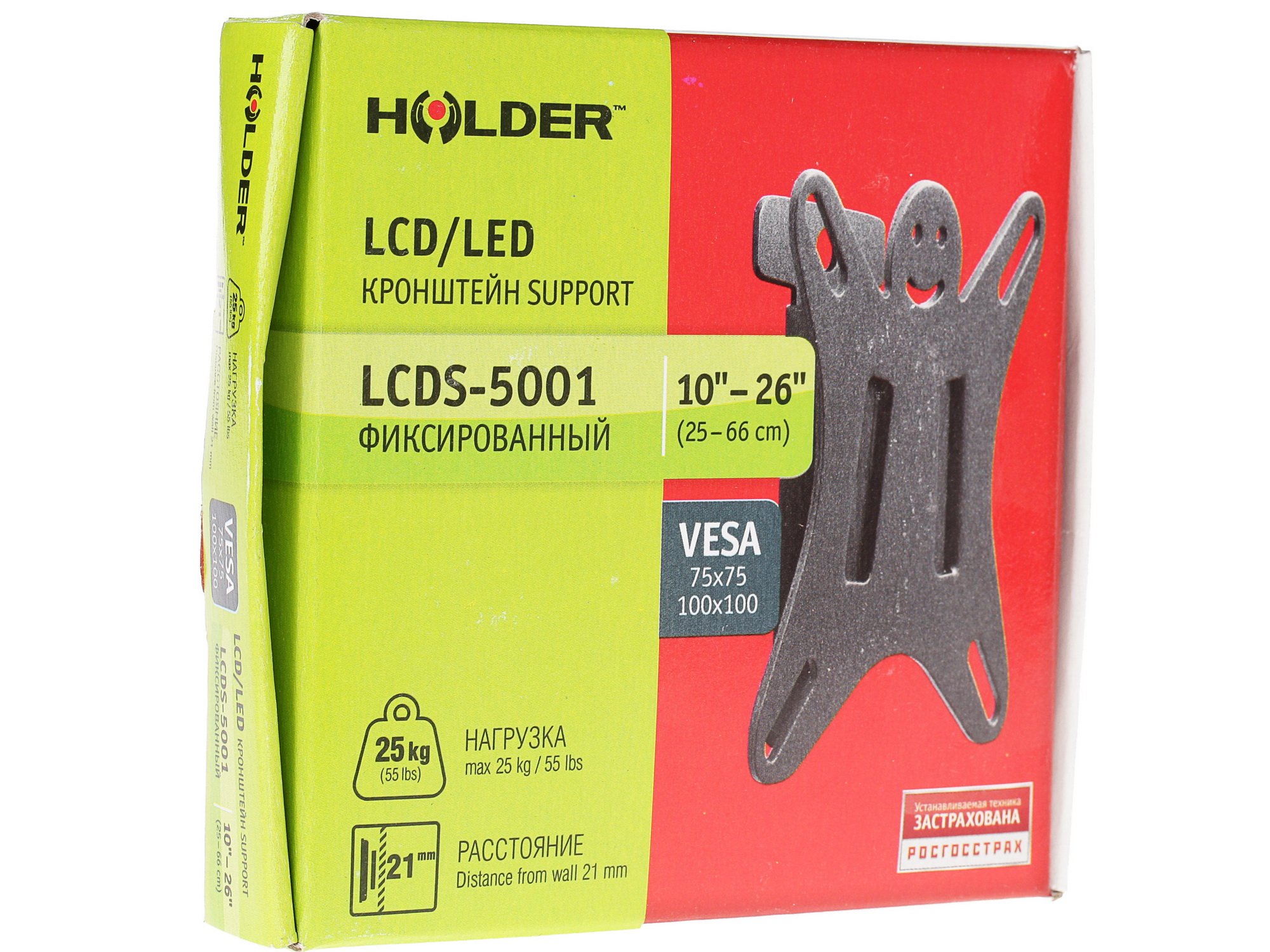 Крепление для ТВ и мониторов Holder LCDS-5001 с фиксированной возможностью крепления настенных телевизоров и мониторов весом не более 25 кг. Стандарты размеров VESA этого кронштейна различаются: от 75х75 до 100х100 мм. Возможные диагонали экранов – от 10 до 32 дюймов. Расстояние от стены не регулируется и составляет 21 мм.