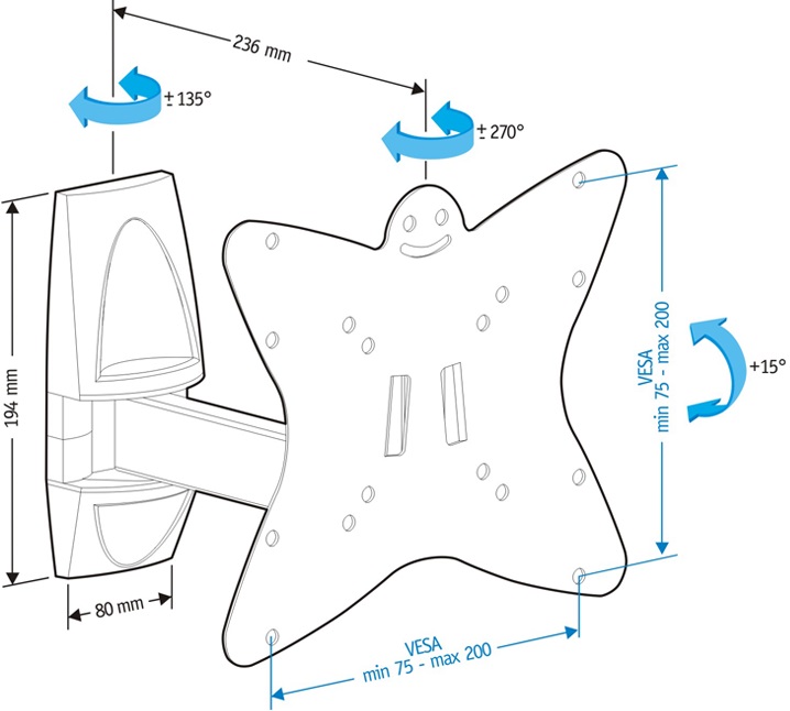 Во-первых, это функция поворота на 180 градусов. Во-вторых, по желанию, можно регулировать наклон телевизора на +6/-15 градусов. В-третьих, это регулировка расстояния от стены: в сложенном состоянии – 95 мм, выдвигается конструкция до 236 мм. Регулировка осуществляется максимально легко, вы можете плавно регулировать кронштейн одной рукой. В-четвертых, полная комплектация, в наборе есть все детали и инструкция.