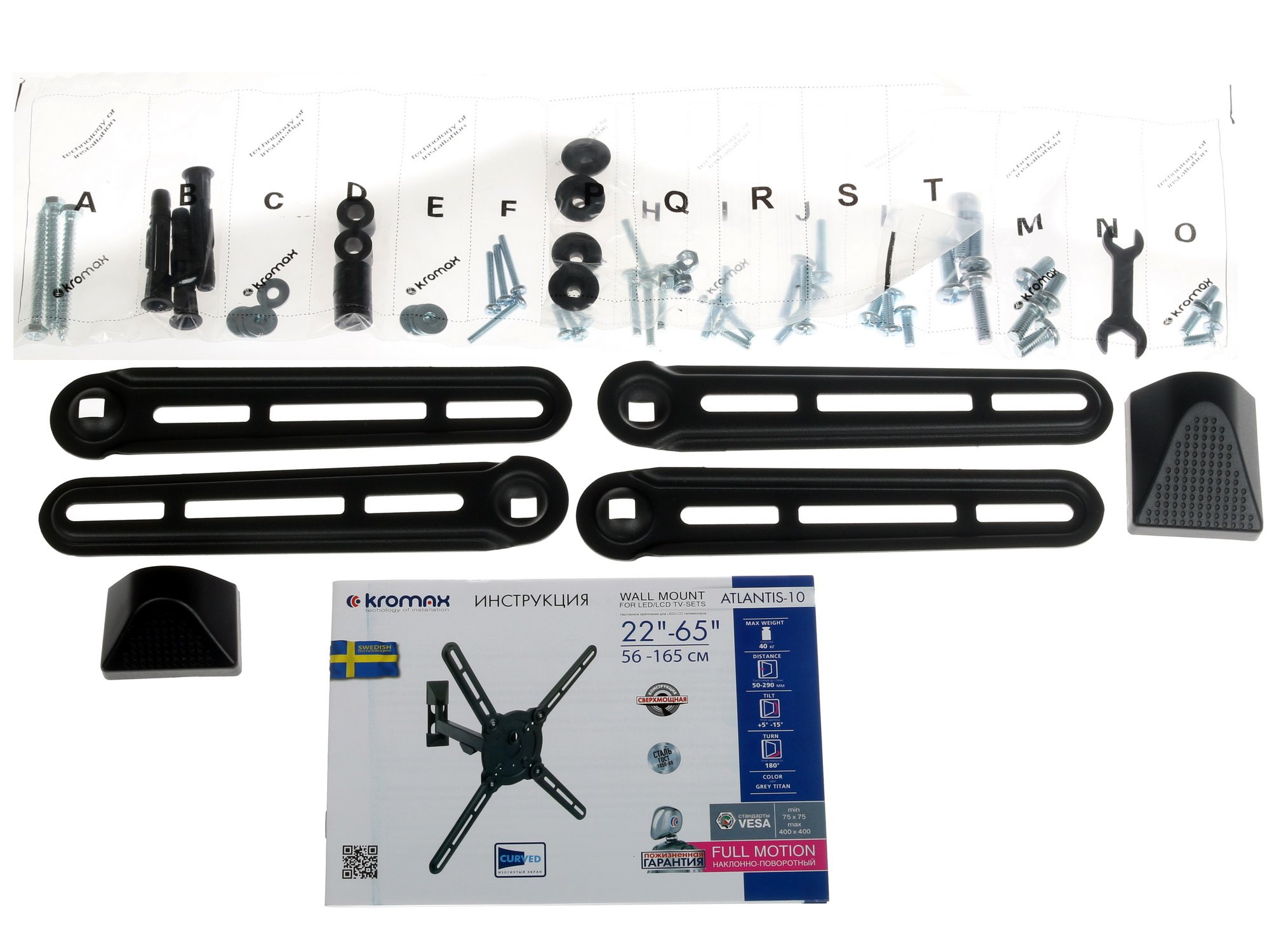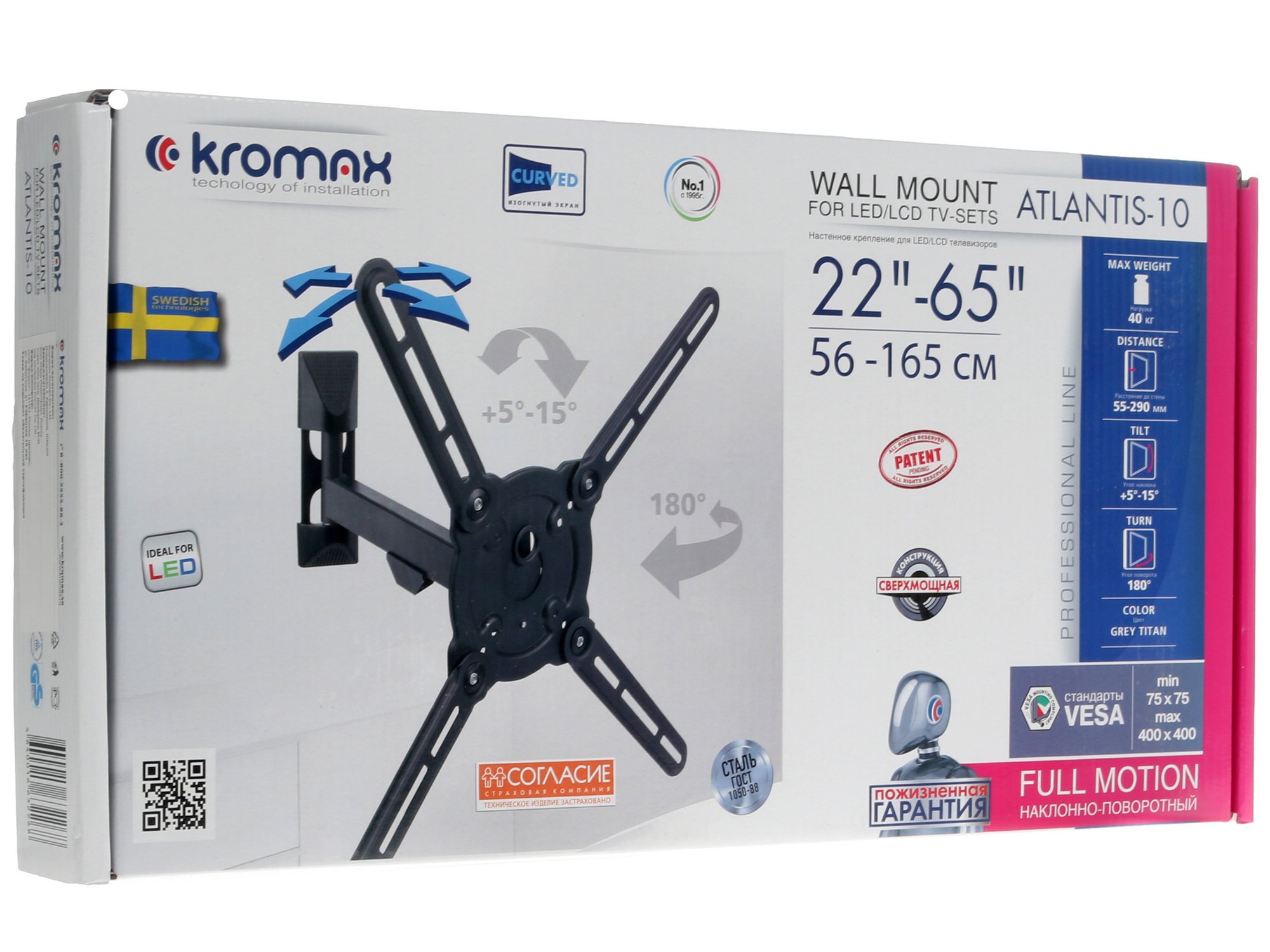 Кронштейн для телевизора Kromax Atlantis-10 поддерживает стандарт VESA: совместимые размеры крепления варьируются от 75x75 до 400x400. Кронштейн допускает регулировку наклона в вертикальной плоскости, и может поворачиваться в горизонтальной плоскости на угол до 180°. С помощью Kromax Atlantis-10 Вы сможете устанавливать на стену телевизоры с диагональю экрана от 22 до 65 дюймов. Кронштейн может располагаться от стены на расстоянии от 55 до 290 мм. Изделие, изготовленное из качественных износостойких материалов, имеет в комплекте полный набор крепежа.