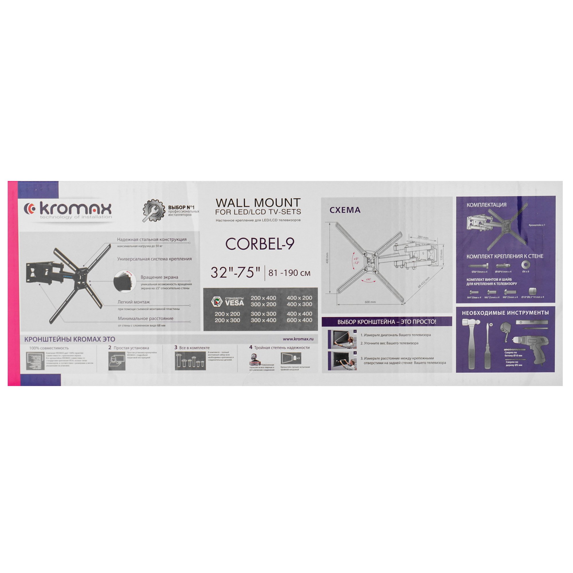 Кронштейн для телевизора Kromax CORBEL-9, 32"-75", макс. 55кг, настенный, поворот и наклон