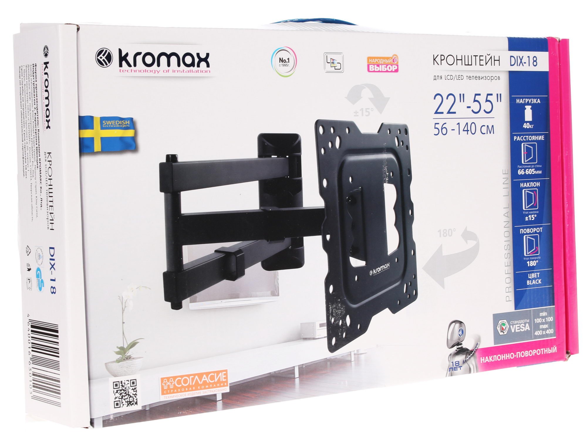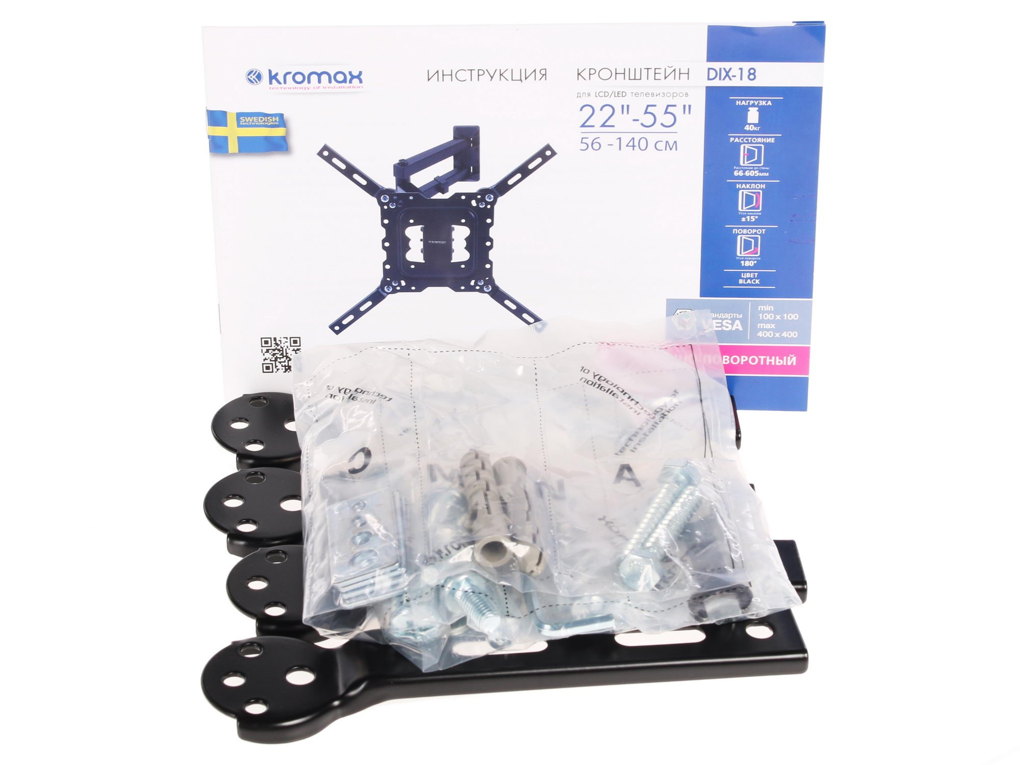 Кронштейн Kromax DIX-18 BLACK(для LED/LCD телевизоров 22"-55", max 40 кг, настенный, 5 ст свободы, наклон ±15°, поворот 180°, от стены 66-605 мм, max VESA 400x400 мм, вращение экрана ±5°, съемная монтажная пластина, кабель-канал, 4 шт/уп.)