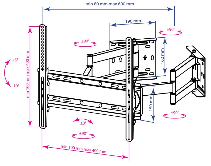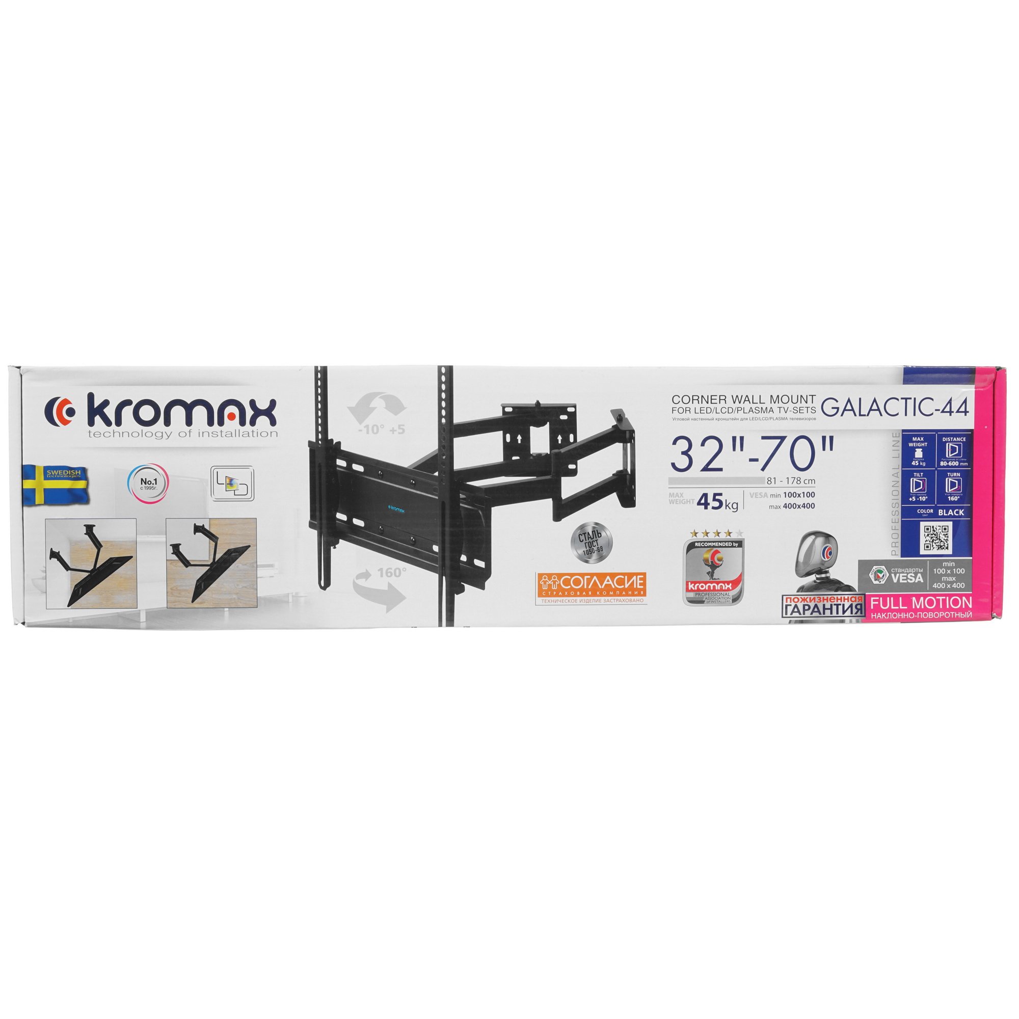 Кронштейн для ТВ Kromax GALACTIC-44 с креплением к двум стенам позволяет компактно разместить телевизор в углу. Он подходит для совместного использования с телевизорами диагональю экрана 32-70 дюймов и характеризуется максимально допустимой нагрузкой 45 кг. Конструкция кронштейна Kromax GALACTIC-44 предусматривает возможность регулировки угла наклона в пределах 5-10 градусов, поворота на 160 градусов и сдвижения к стене с регулировкой расстояния 80-600 мм. Высокая прочность конструкции гарантирует надежность и долговечность в эксплуатации.