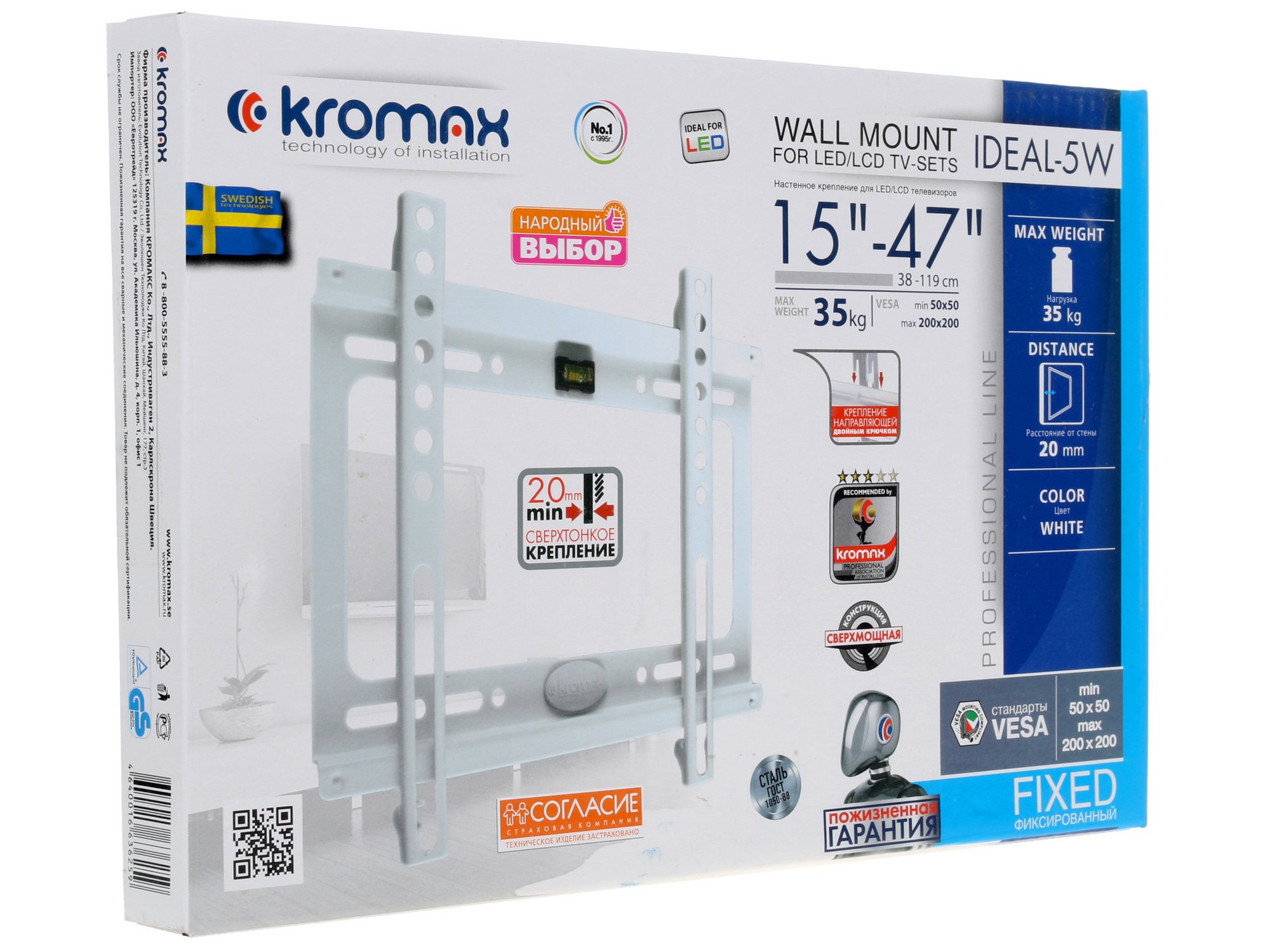 Кронштейн для ТВ Kromax IDEAL-5 оборудован защитой от падения, что делает его надежным аксессуаром, способным надежно зафиксировать на стене телевизор. Это фиксированный кронштейн, который подходит для крепления телевизоров, обладают диагональю экрана 15"-47". Максимальная нагрузка на кронштейн может составлять 40 кг. При помощи этого приспособления вы сможете расположить телевизор довольно близко к стене – на расстоянии 20 мм от нее.