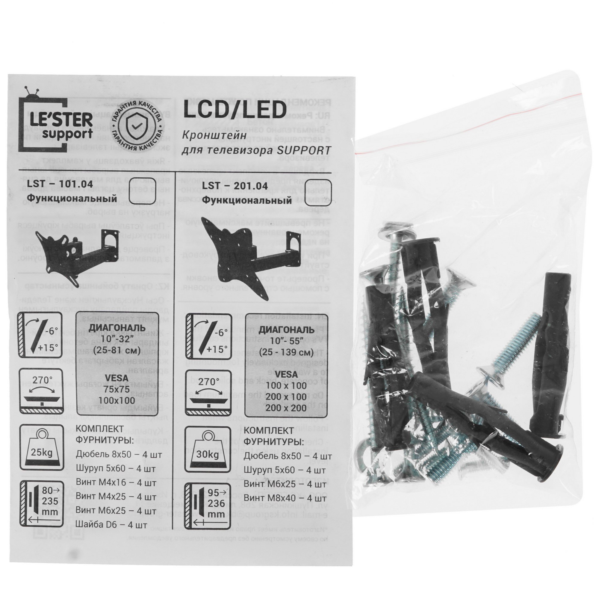 Кронштейн для ТВ LE'STER LST-101.04 выполнен на основе исключительно прочных материалов, которые не боятся преждевременного повреждения и продемонстрируют устойчивость к нагрузке до 25 кг. Невосполнимое достоинство изделия – использование не только с небольшими телевизорами, но и мониторами диагональю от 10 до 32 дюймов.