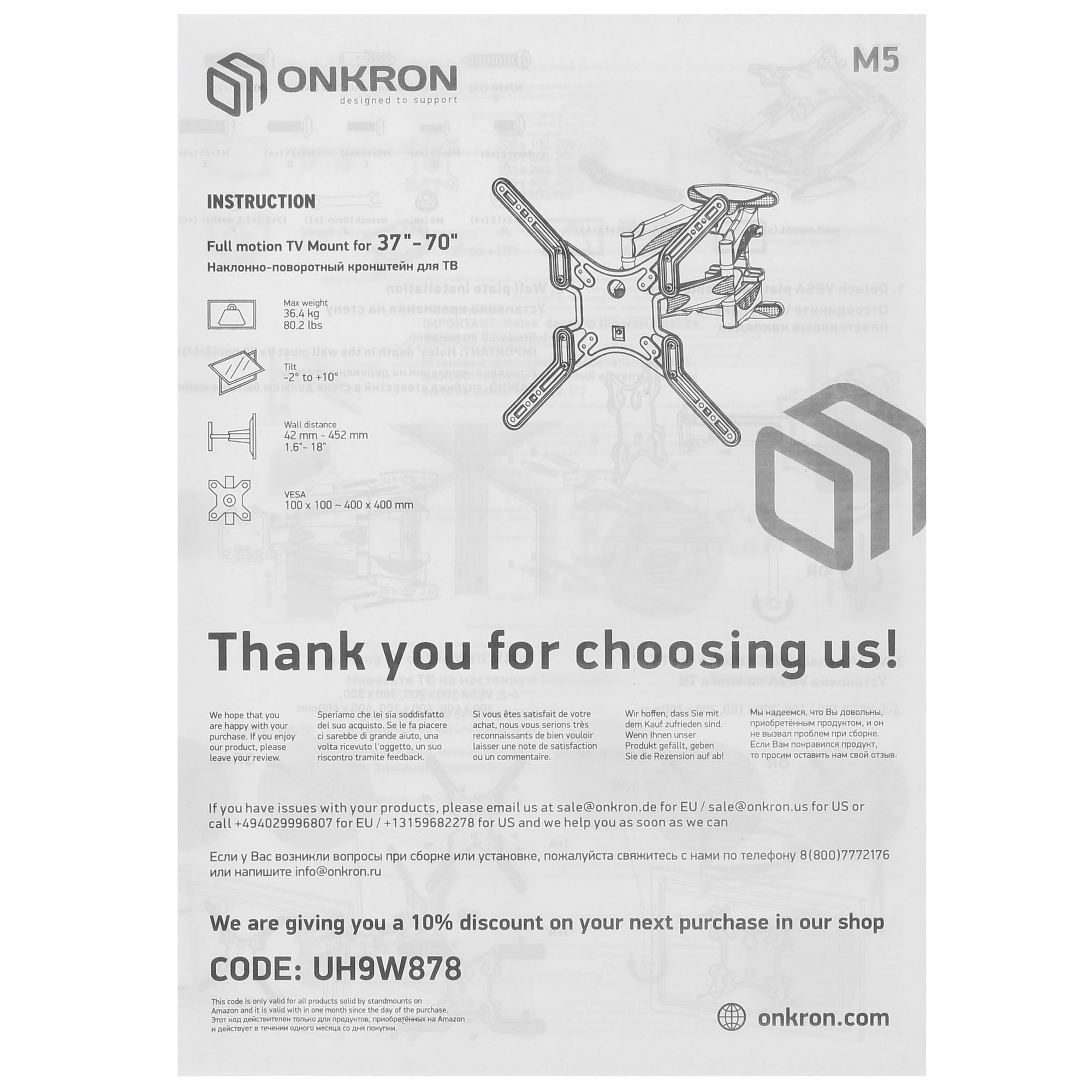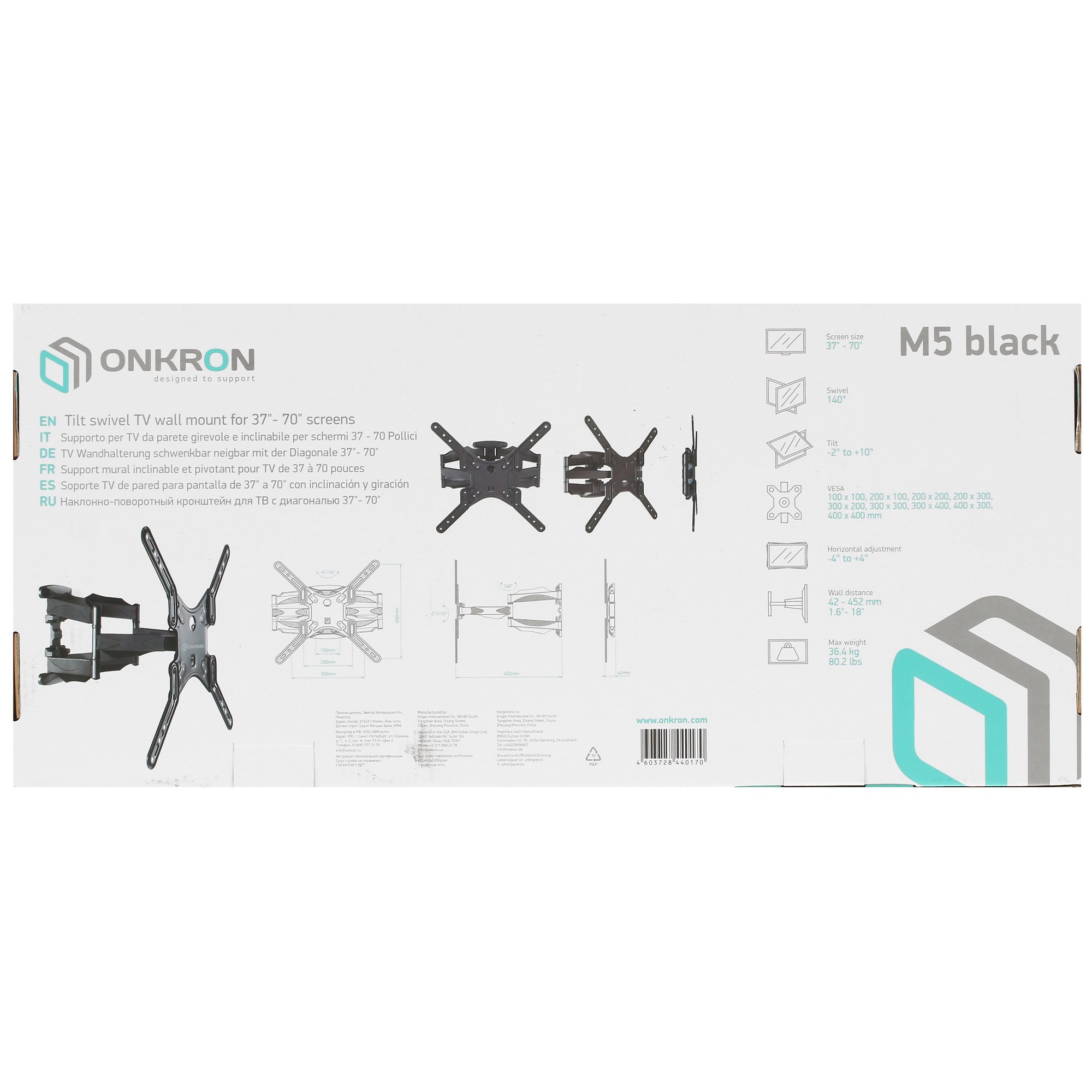 При создании кронштейна для ТВ ONKRON M5 производитель задействовал исключительно износоустойчивые материалы, которые не боятся ежедневной нагрузки до 36.4 кг. Благодаря прочной конструкции обеспечивается надежное настенное крепление изделия. Поразительная маневренность – еще одна отличительная черта представленной модели. Так, вы без труда подберете наиболее подходящий угол наклона и поворота для комфортного просмотра разнообразного контента.
