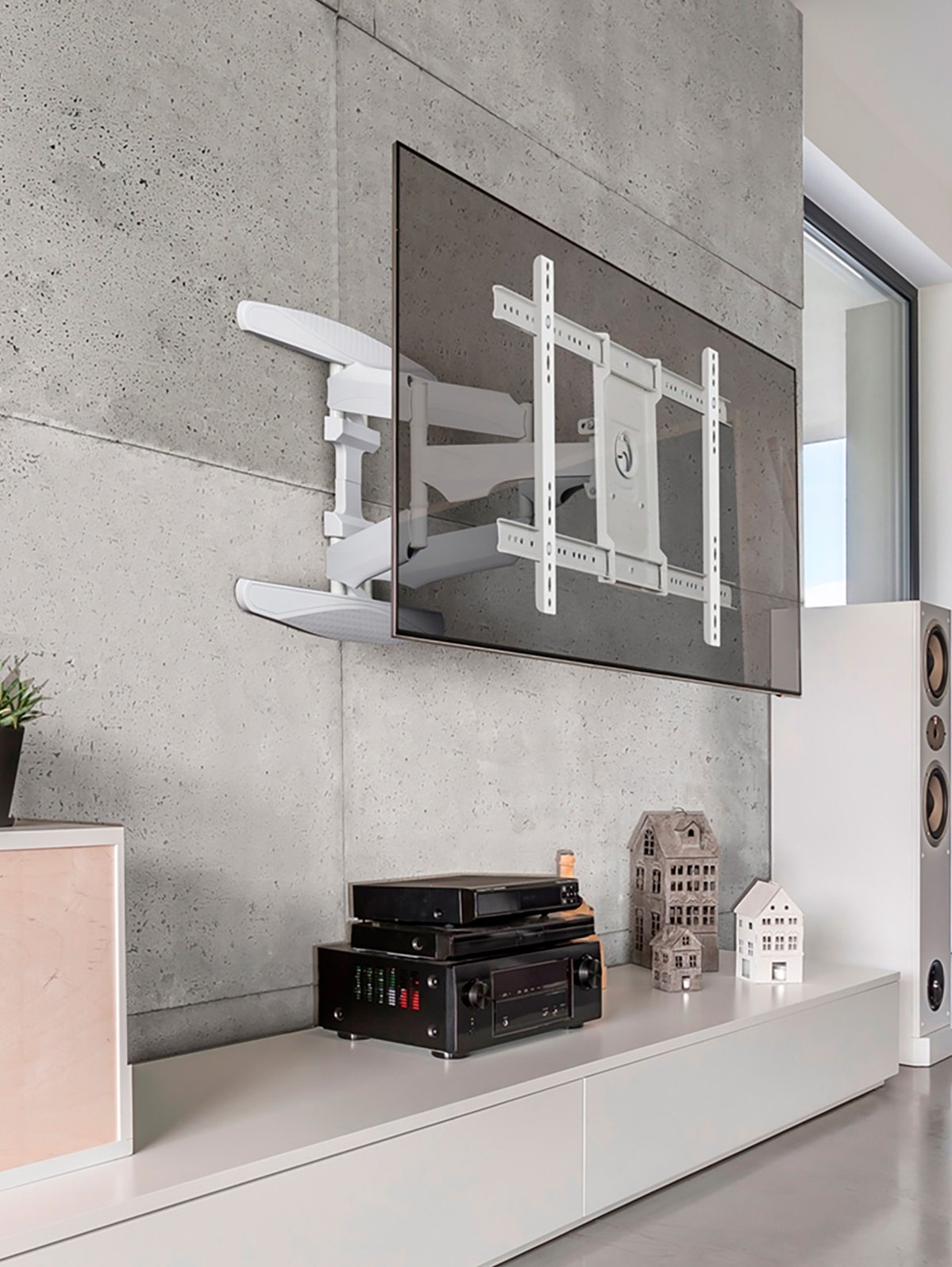 Кронштейн для ТВ ONKRON M6L с двухколенной конструкцией и углом поворота ответной части 140° обеспечит вас максимумом функций и надежностью при размещении телевизора на стене. Широчайшая поддержка различных стандартов VESA позволит использовать эту модель с ТВ, имеющими как универсальные крепления, так и нестандартные соотношения VESA. Прочная стальная конструкция позволяет кронштейну выдерживать внушительную нагрузку - до 45.5 кг. Стандартная белая расцветка способствует малозаметности устройства за корпусом телевизора и в общем интерьере помещения.