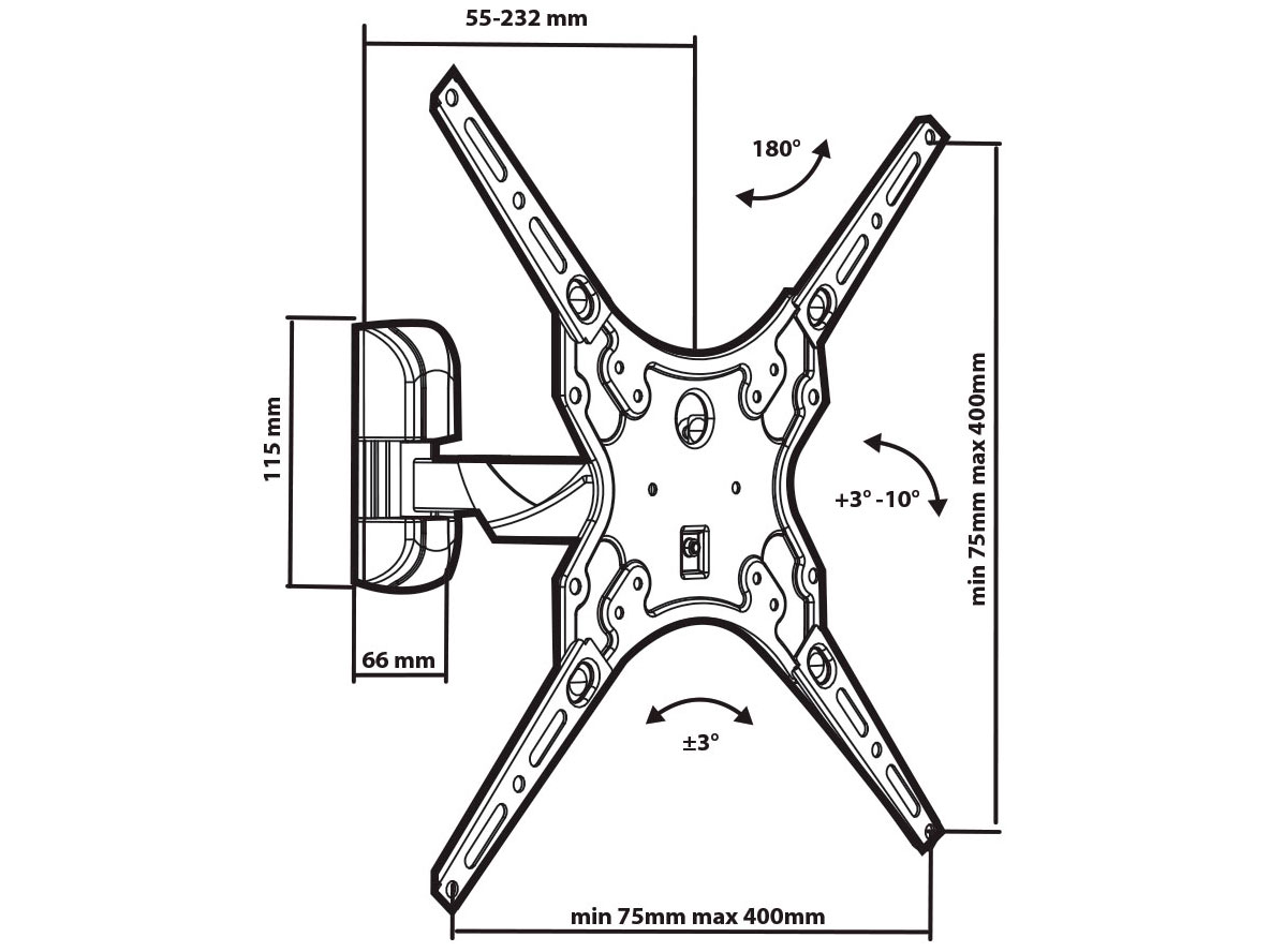 Кронштейн для телевизора настенный Tuarex OLIMP-304 черный для TV 26"-60" max 55 кг, 1 ст св., нак. 0°-12°, от ст. 37 мм., max VESA 400x400 мм.
