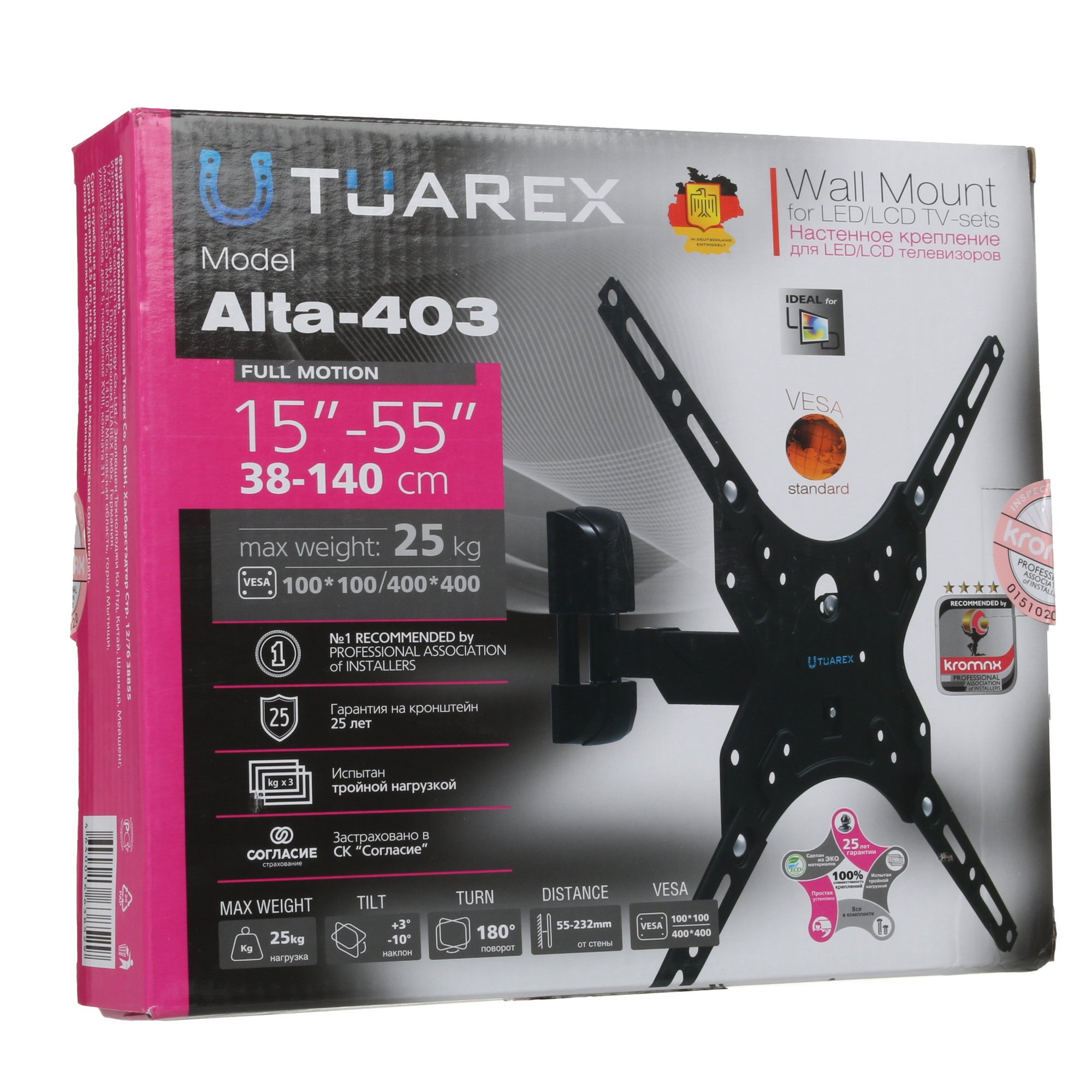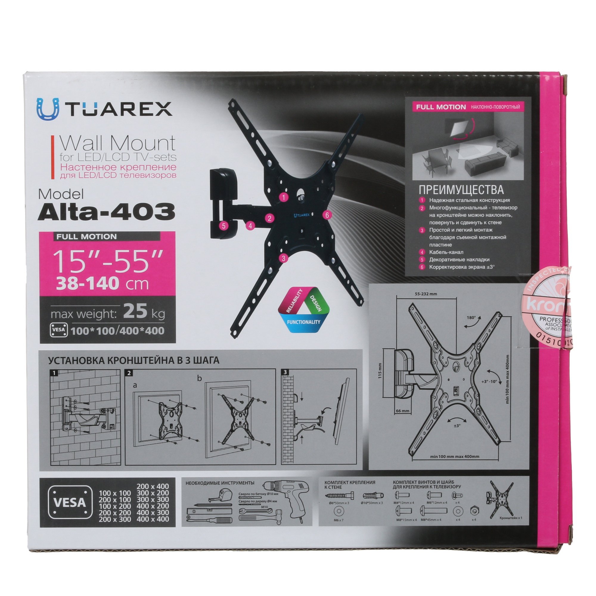 Отличительной чертой кронштейна для ТВ Tuarex ALTA-403 является площадка повышенной прочности, которая позволяет ему ежедневно выдерживать нагрузку до 25 кг. Особенность вашего помощника – полностью регулируемая конструкция. Таким образом, у вас не возникнет трудностей с выбором подходящего угла наклона и поворота. Встроенный кабель-канал спрячет провода, нарушающие эстетичный вид помещения. Последующая фиксация изделия производится не только в домашних, но также учебных и офисных помещениях при необходимости транслировать контент широкой аудитории.