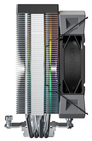 Кулер для процессора Montech NX400 ARGB оснащен четырьмя эффективными медными трубками и одним вентилятором 120 мм. Мощность рассеивания до 220 Вт гарантирует быстрое охлаждение процессора. Плоское основание с медными трубками ускоряет передачу тепла радиатору, который охлаждает и рассеивает воздух.