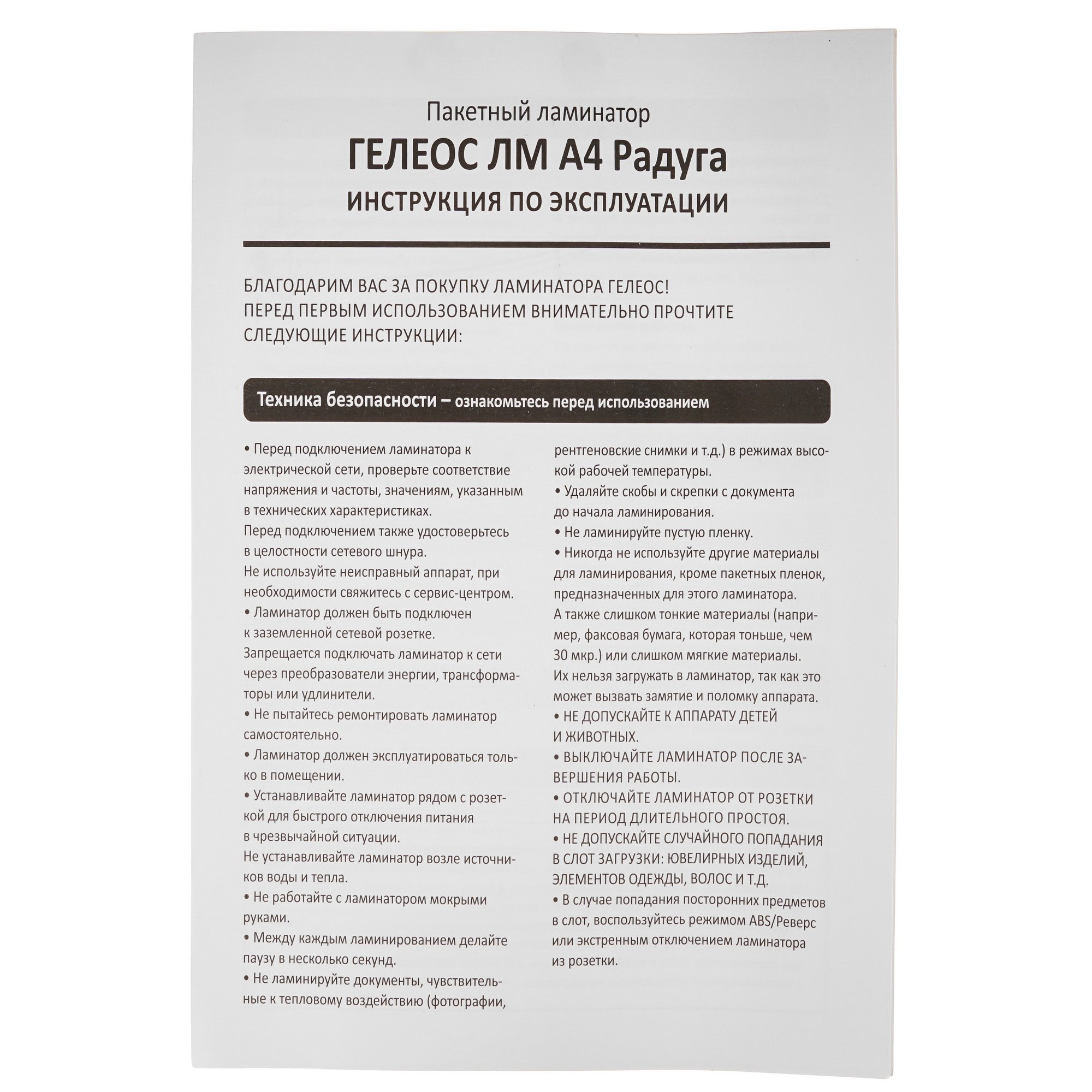 Ламинатор ГЕЛЕОС ЛМ A4 Радуга подходит для ламинирования бумаг формата А4 или меньше. В процессе покрытия пленкой бумаги проходят через сопло прибора шириной 230 мм. Мощности в 210 Вт достаточно, чтобы обеспечить скорость ламинирования в 250 мм/мин. Простейшее ручное управление делает инструмент удобным для частого использования.
