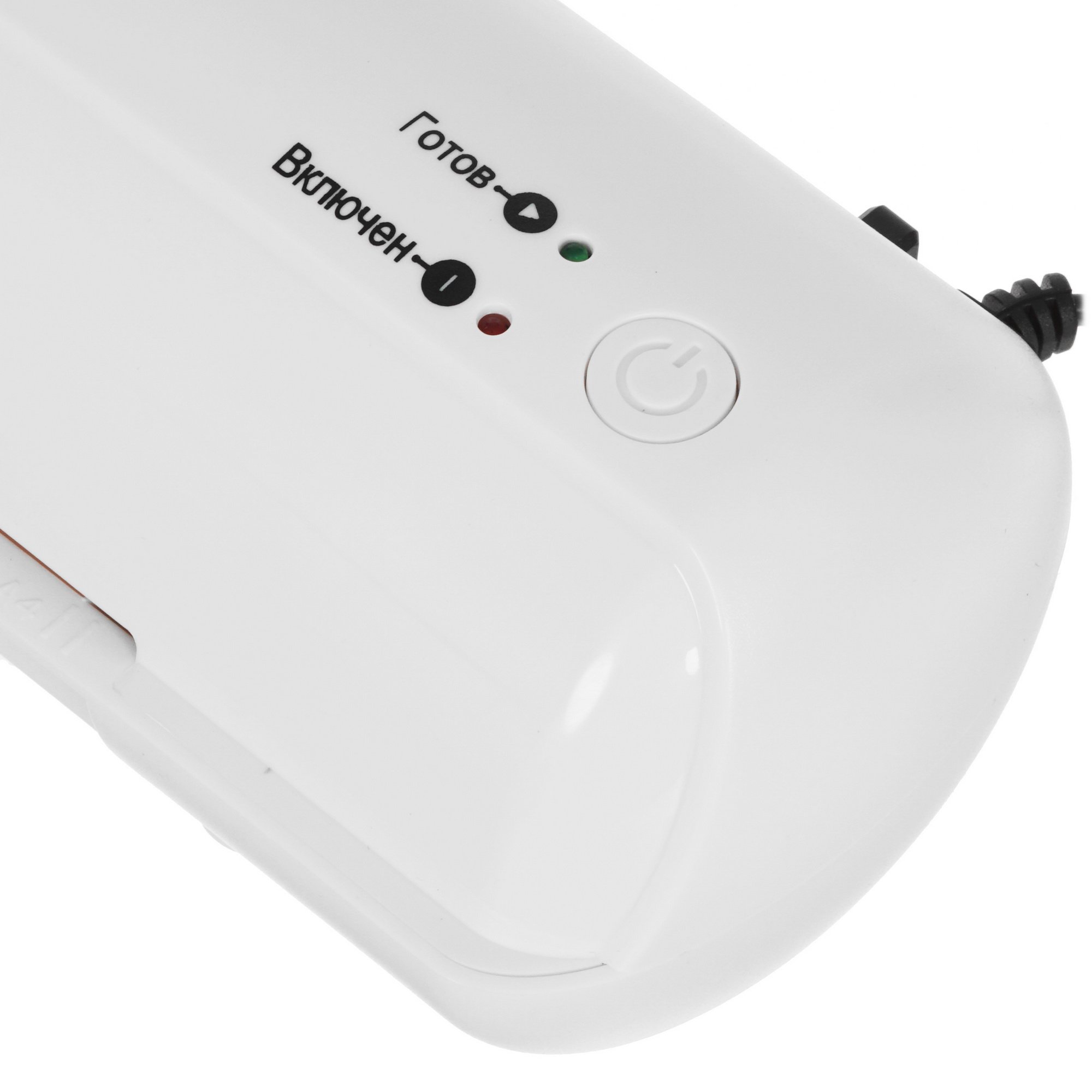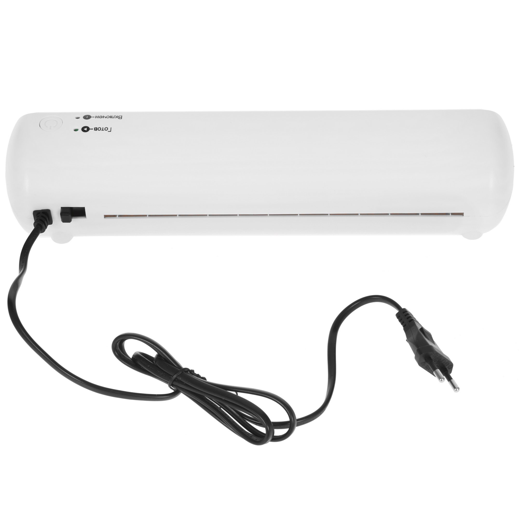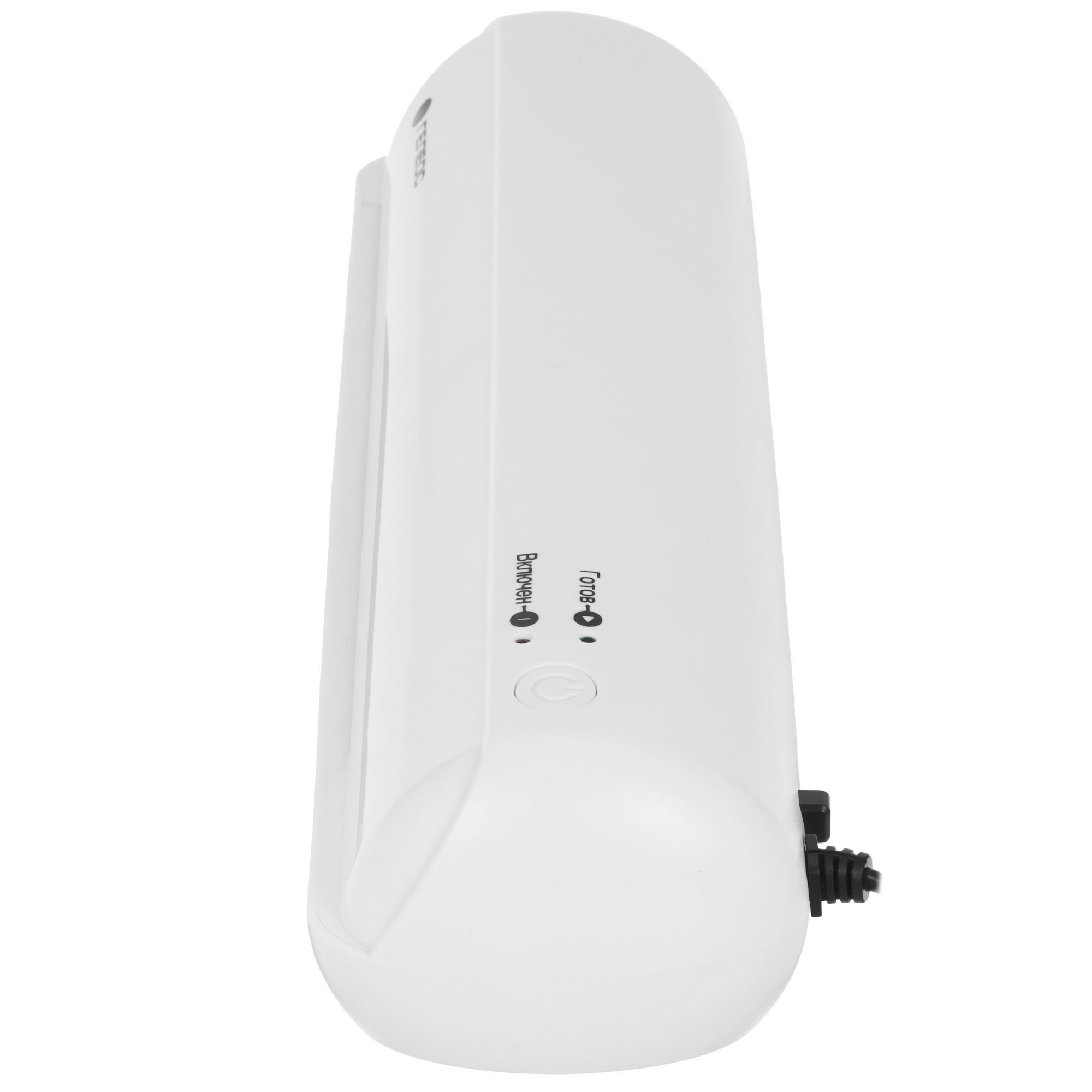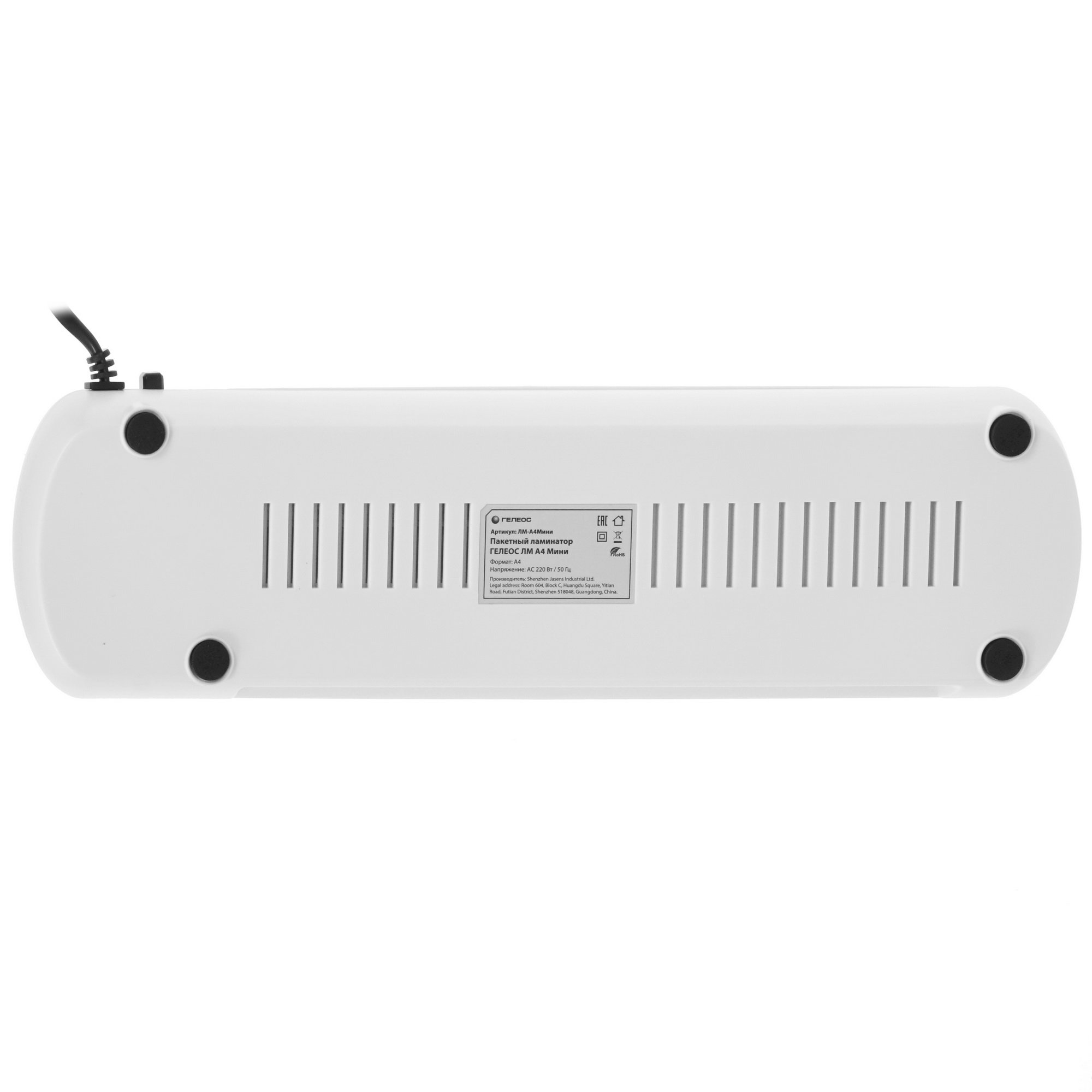 Ламинатор ГЕЛЕОС ЛМ A4 Мини в корпусе из белого пластика после подключения к сети 220 В и включения разогревается до рабочей температуры в течение 4 минут. Для сигнализирования о готовности к работе в прибор встроен световой индикатор. Ламинатор с потребляемой мощностью 295 Вт рассчитан на использование пленки толщиной 75-150 мкм в качестве материала для ламинирования.
