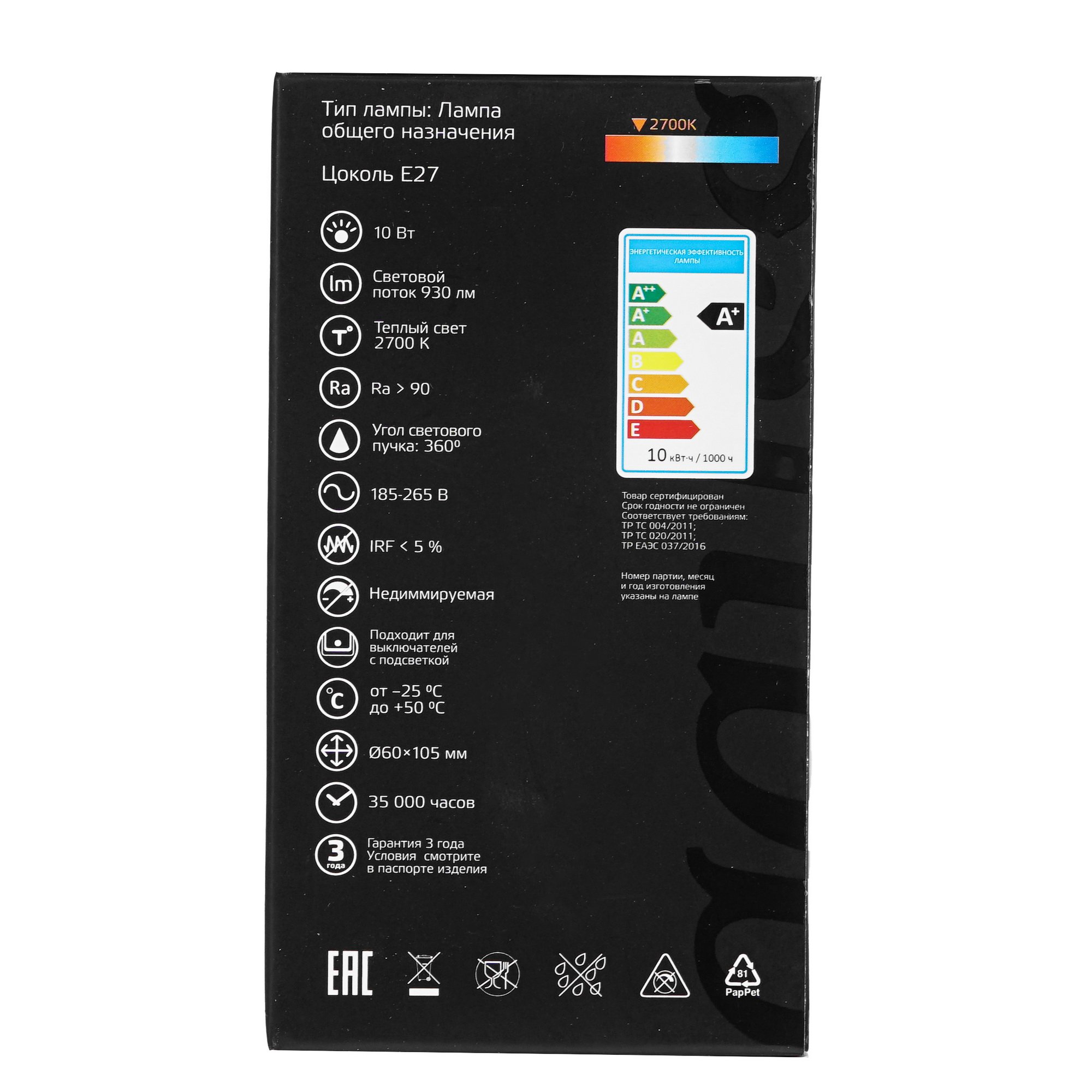 Лампа филаментная Gauss Filament А60 10W 930lm 2700К Е27 LED 1/10/40 с цоколем E27 подходит для установки в большинство люстр, бра и других осветительных устройств. Модель с цветовой температурой 2700 K выдает оптимальный для спальни, зала, кухни и других жилых помещений теплый белый свет. Благодаря углу пучка 360° и световому потоку 930 лм лампа ярко освещает комнату и подходит для работы в виде основного источника освещения.