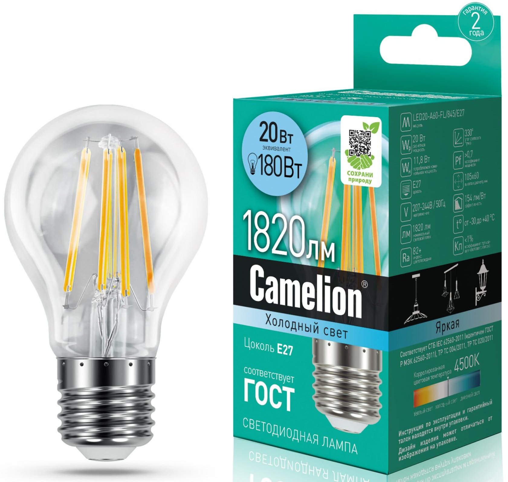 Camelion LED20-A60-FL/845/E27 шаровидной формы оборудована цоколем Е27 для фиксации в различных осветительных приборах. Замена изделия требуется после 30000 ч эксплуатации. Модель устойчива к температурным колебаниям от -30°C до +40°C.