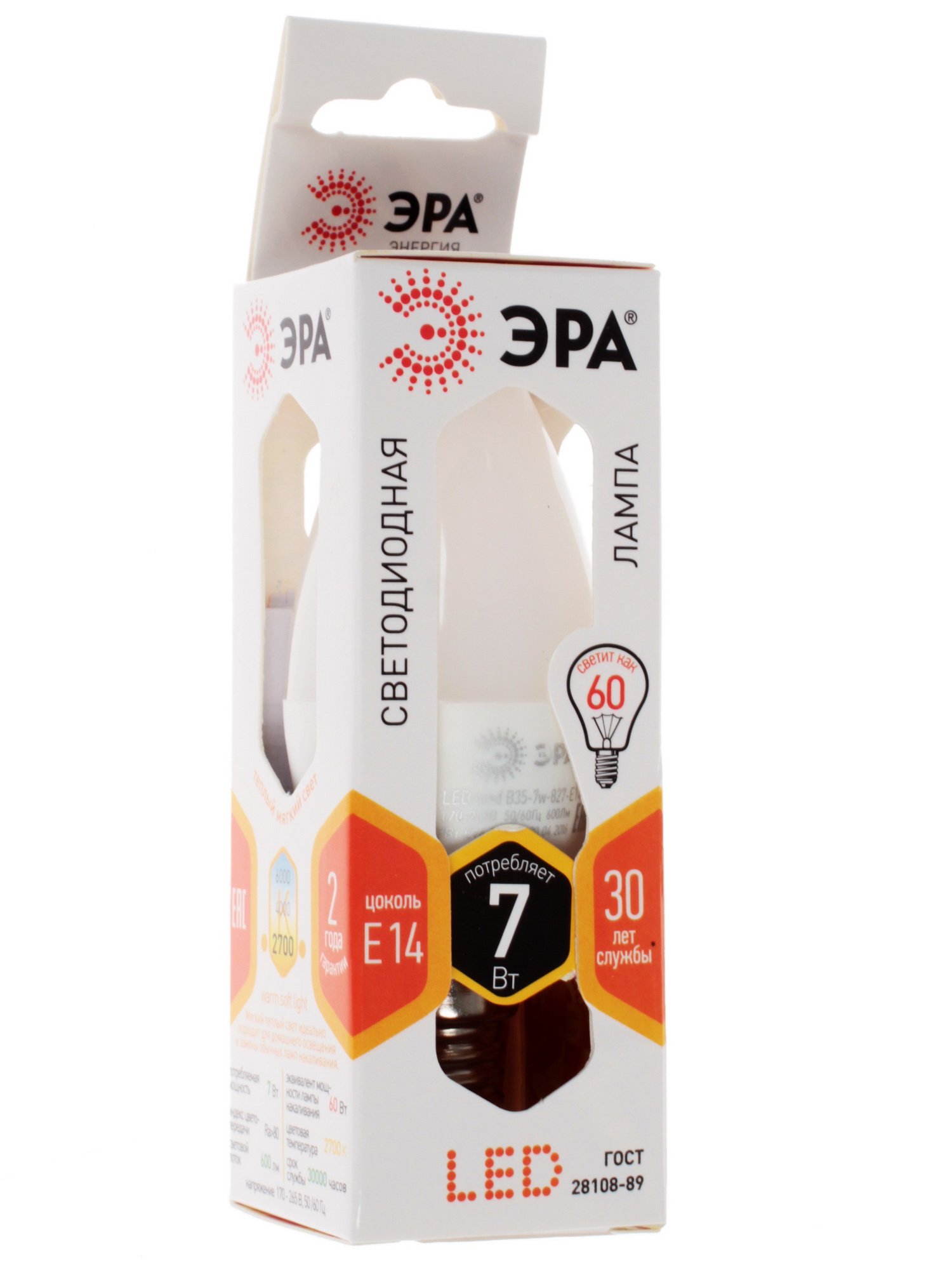 ЭРА LED smd B35-7w-827-E14 обладает матовой белой колбой и рассчитана на 30 000 часов работы. Однако стоит учитывать, что этот показатель указан для безостановочной работы, а лампа используется всего несколько часов в сутки. Это значит, что указанные 30 000 часов могут «растянуть» работу устройства на 30 лет. Модель потребляет всего 7 ватт электричества, а диапазон рабочего напряжения колеблется от 170 до 265 вольт.