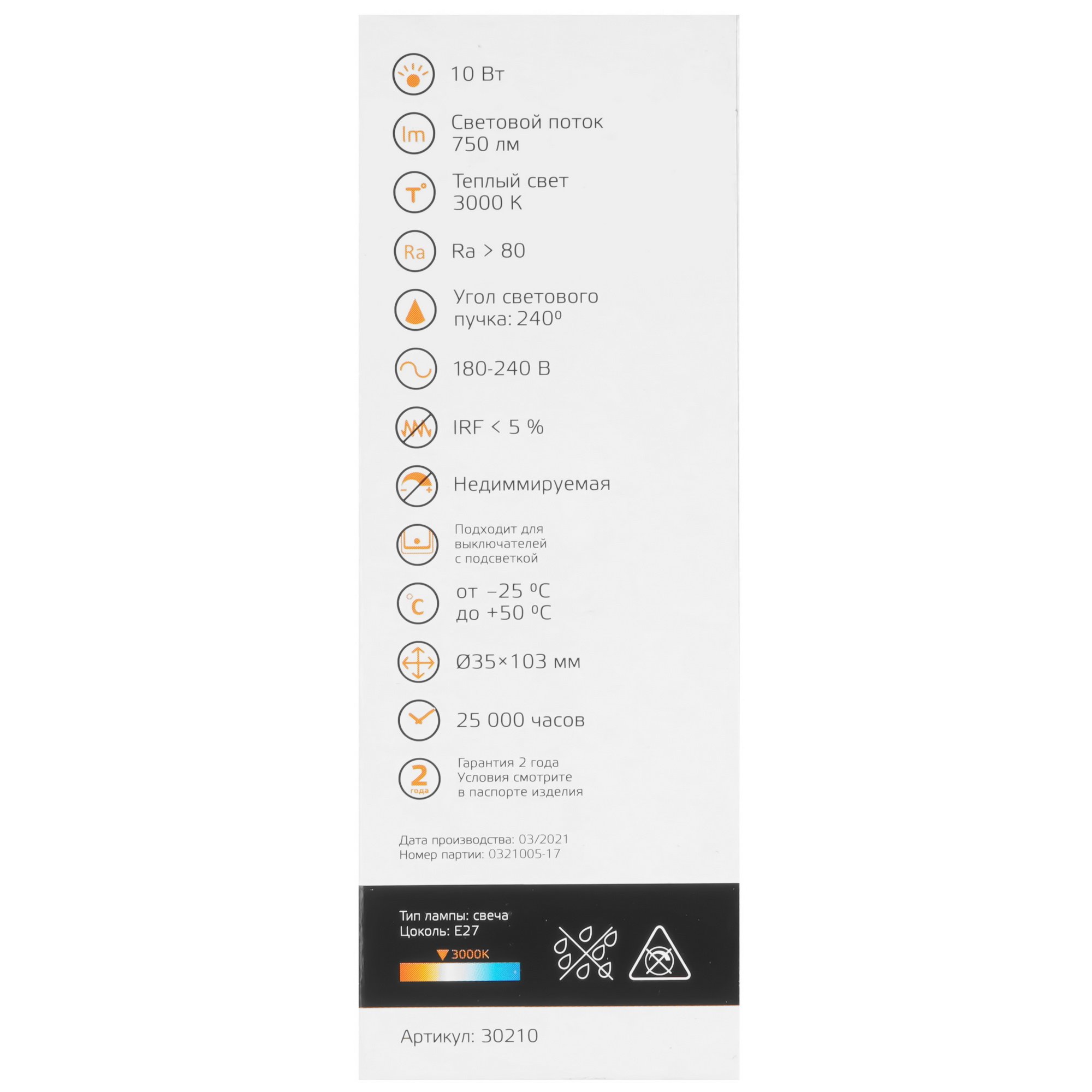 Мощность лампы светодиодной Gauss Elementary Свеча составляет 10 Вт. Изделие генерирует световой поток 750 лм. Показатель эквивалентен светоотдаче лампы накаливания с энергопотреблением 85 Вт.