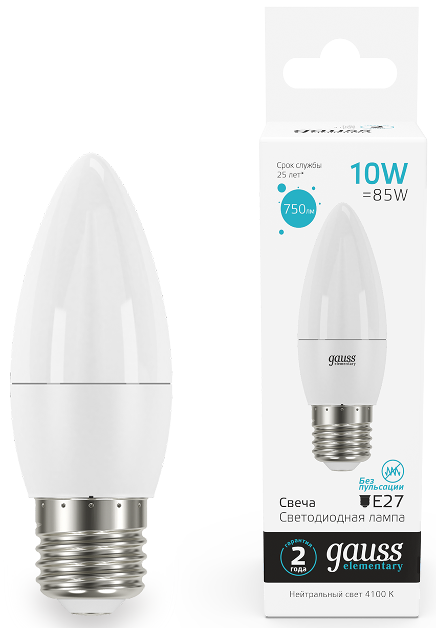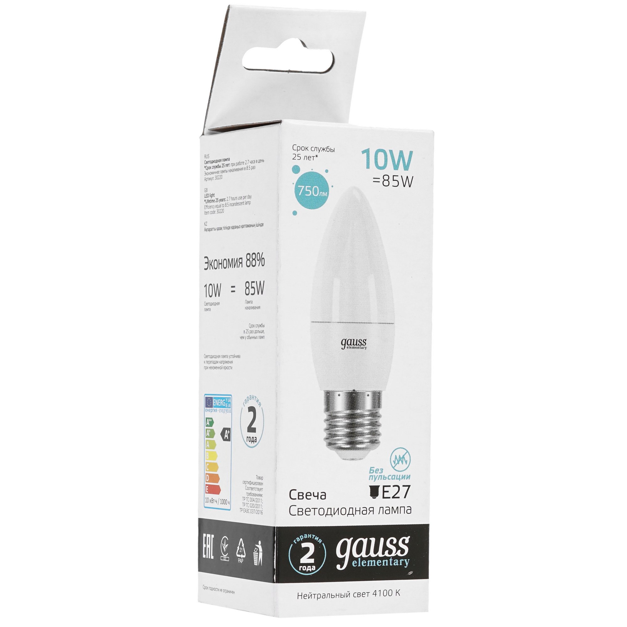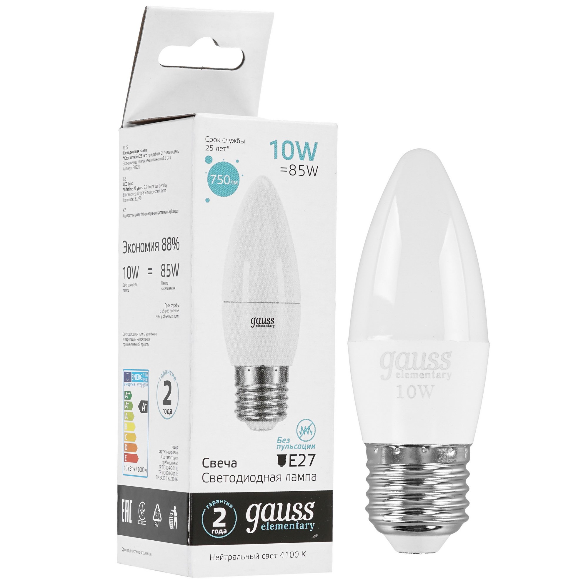 Лампа светодиодная Gauss Elementary Свеча 10W 750lm 4100K E27 LED 1/10/100 свечеобразной формы имеет цоколь Е27, может работать в помещениях и на улице. Она заменяет традиционные лампы накаливания с мощностью 85 Вт и выдает световой поток 750 Лм при энергопотреблении в 10 Вт. Благодаря индексу цветопередачи 80 Ra модель хорошо передает цвета окружающих предметов. Нейтральный белый свет с цветовой температурой 4100K будет предпочтителен для жилых помещений, кафе, магазинов и витрин. Срок службы Gauss Elementary Свеча 10W 750lm 4100K E27 LED 1/10/100 составляет примерно 25000 часов – это почти 3 года даже при интенсивном использовании.