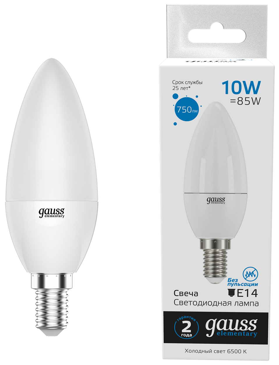 Лампа светодиодная Gauss Elementary Свеча 10W 750lm 6500K Е14 LED 1/10/100 свечеобразной формы имеет цоколь Е14, может работать в помещениях и на улице. Она заменяет традиционные лампы накаливания с мощностью 85 Вт и выдает световой поток 750 Лм при энергопотреблении в 10 Вт. Благодаря индексу цветопередачи 80 Ra модель хорошо передает цвета окружающих предметов. Холодный белый свет с цветовой температурой 6500K будет предпочтителен для жилых помещений, кафе, магазинов и витрин. Срок службы Gauss Elementary Свеча 10W 750lm 6500K Е14 LED 1/10/100 составляет примерно 25000 часов – это почти 3 года даже при интенсивном использовании.