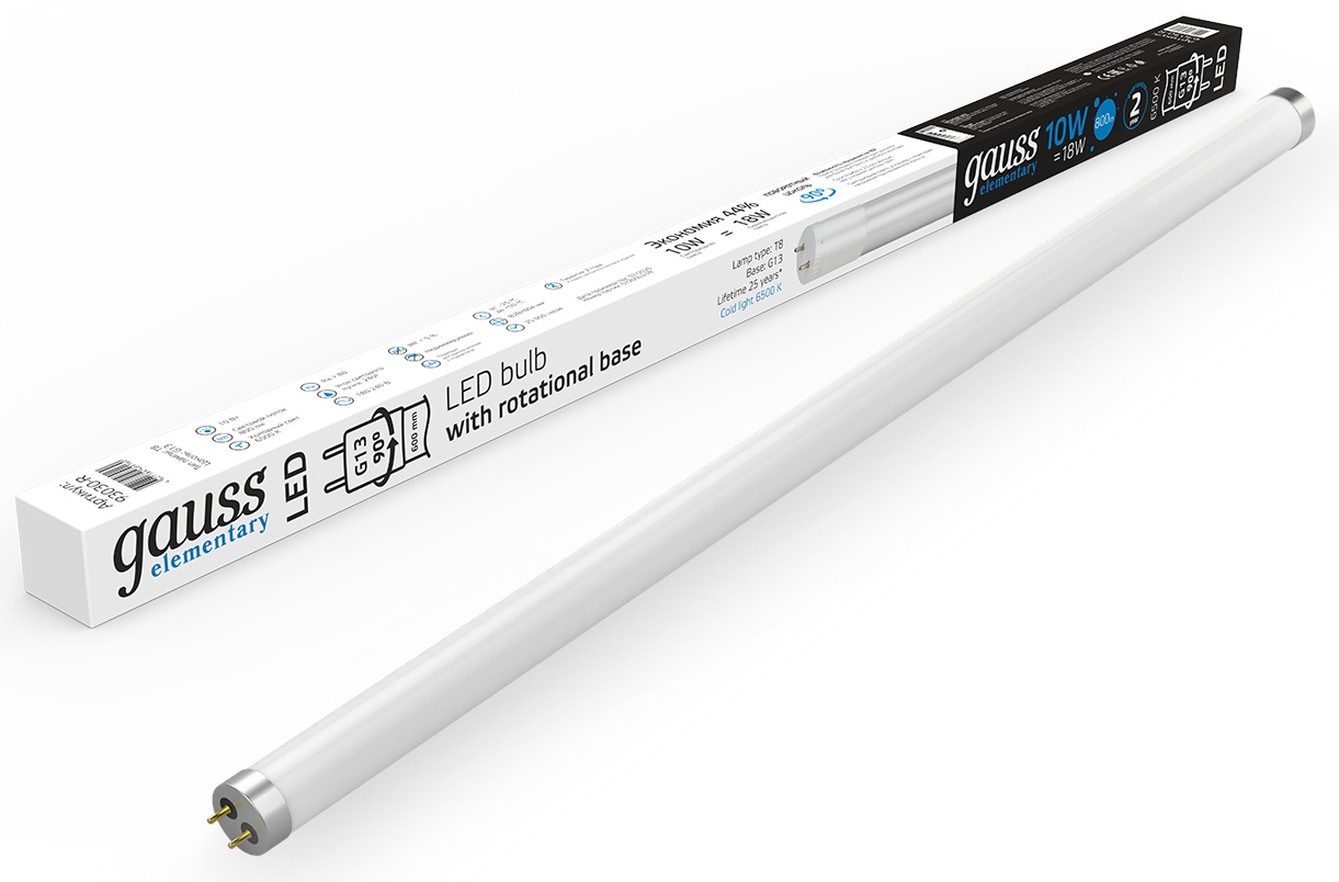 Лампа светодиодная Gauss Elementary T8 с цоколем G13 пригодится владельцам светильников, которые совместимы с люминесцентными лампами Т8. Количество в коробке – 1. Длина изделия равна 600 мм.