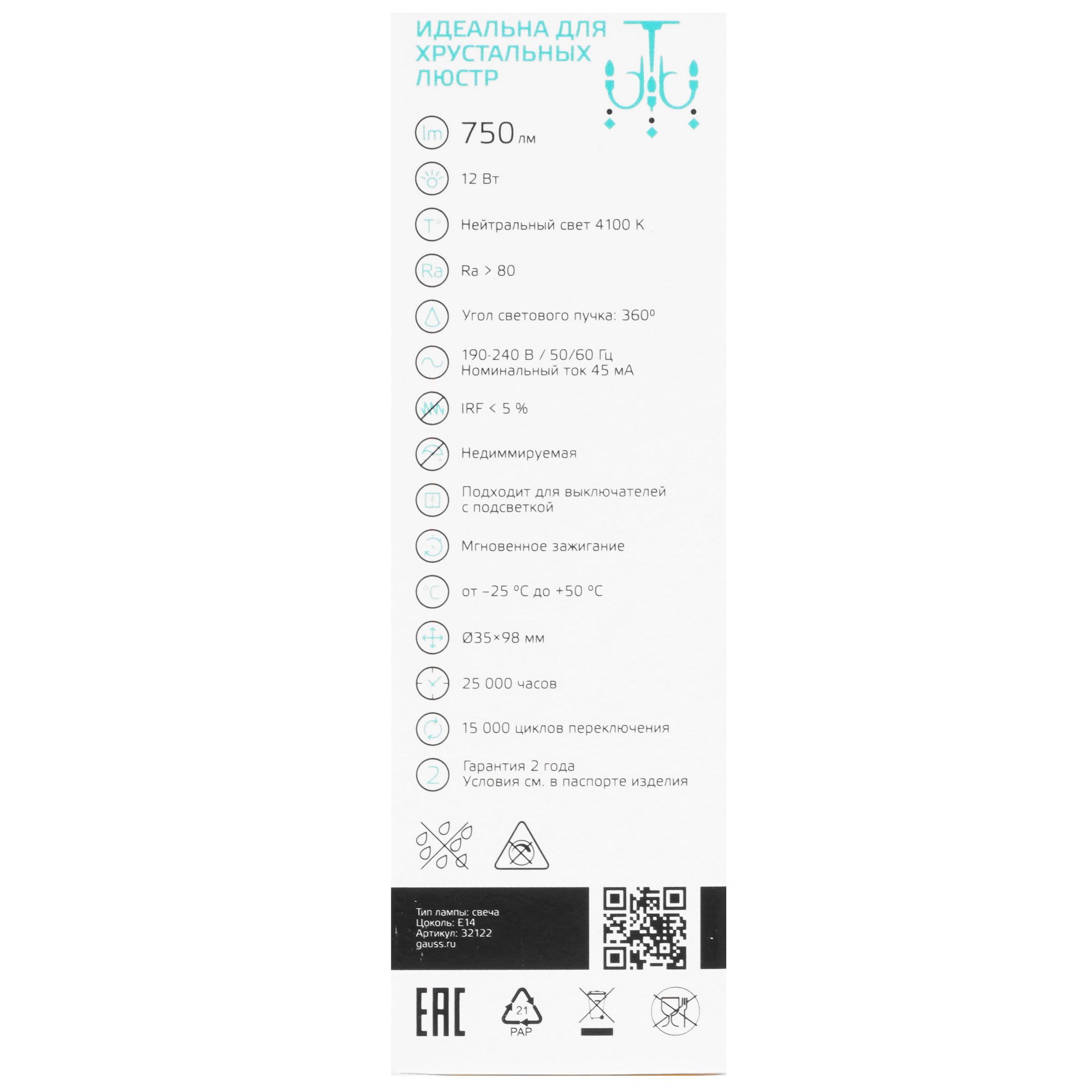 Лампа светодиодная Gauss Filament Elementary Свеча 12W 750lm 4100К Е14 LED 1/10/100 имеет степень защиты IP20 и может размещаться в сухих помещения при температуре от -25°C до +50°C. Прозрачная свечеобразная колба изготовлена из стекла и алюминия. Мощность 12 Вт выдает световой поток 750 лм и заменяет лампу накаливания 75 Вт. Нейтральный белый цвет не слепит и не нагружает зрение. Цоколь Е14 позволяет установить модель в узкие плафоны, бра и декоративные светильники. Индекс 80 Ra подойдет для мест, где не требуется точная цветопередача без искажений. Gauss Filament Elementary Свеча 12W 750lm 4100К Е14 LED 1/10/100 светит до 25000 ч непрерывно.
