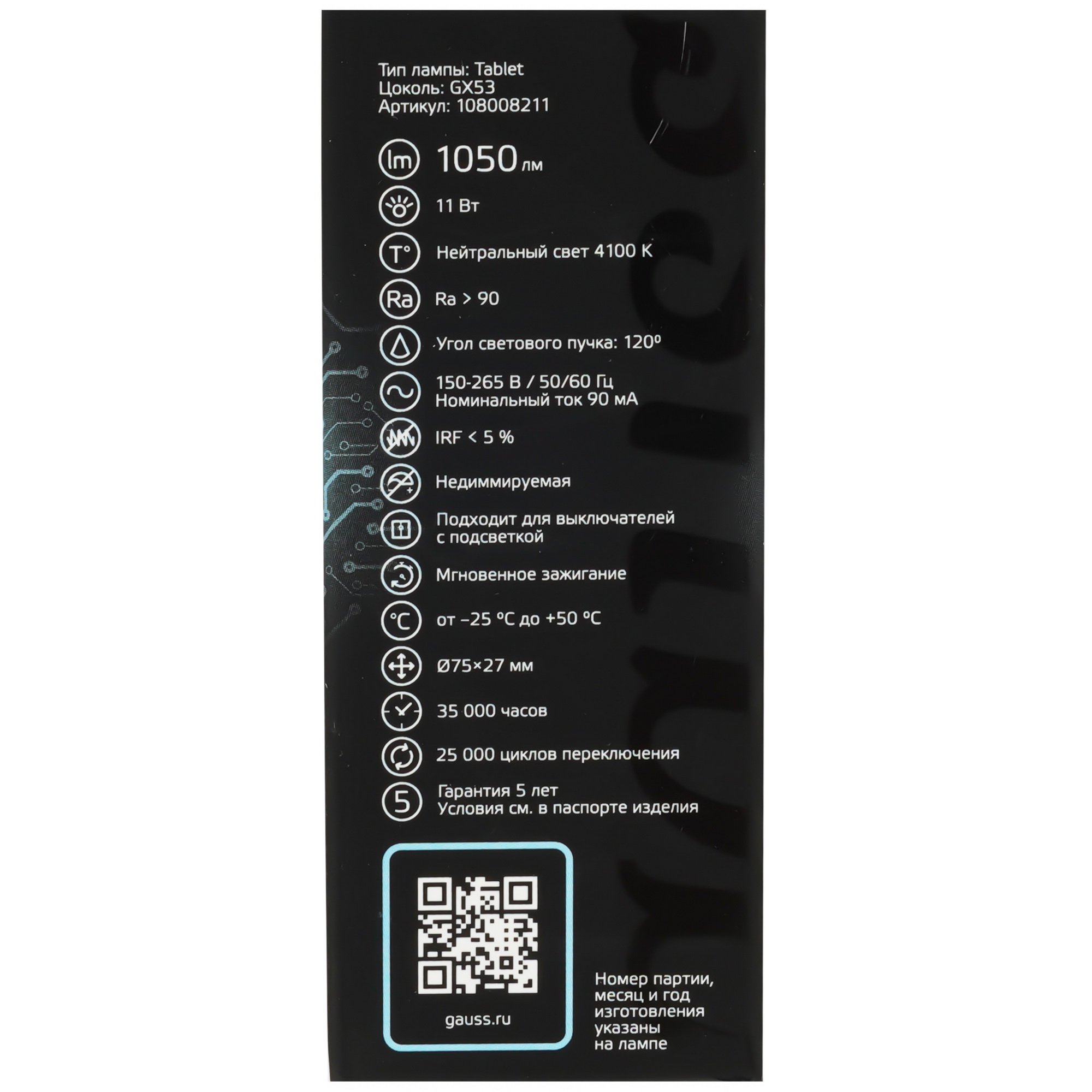 Лампа светодиодная Gauss GX53 11W 1050lm 4100K LED 1/10/100 имеет степень защиты IP20 и может размещаться в сухих помещения при температуре от -25°C до +50°C. Белая матовая колба в форме таблетки изготовлена из пластика и алюминия. Мощность 11 Вт выдает световой поток 1050 лм и заменяет лампу накаливания 95 Вт. Нейтральный белый цвет не слепит и не нагружает зрение. Цоколь GX53 монтируется в мебель, натяжные и навесные потолки. Индекс 90 Ra передает точные оттенки цветов окружающих предметов. Gauss GX53 11W 1050lm 4100K LED 1/10/100 светит до 35000 ч непрерывно.
