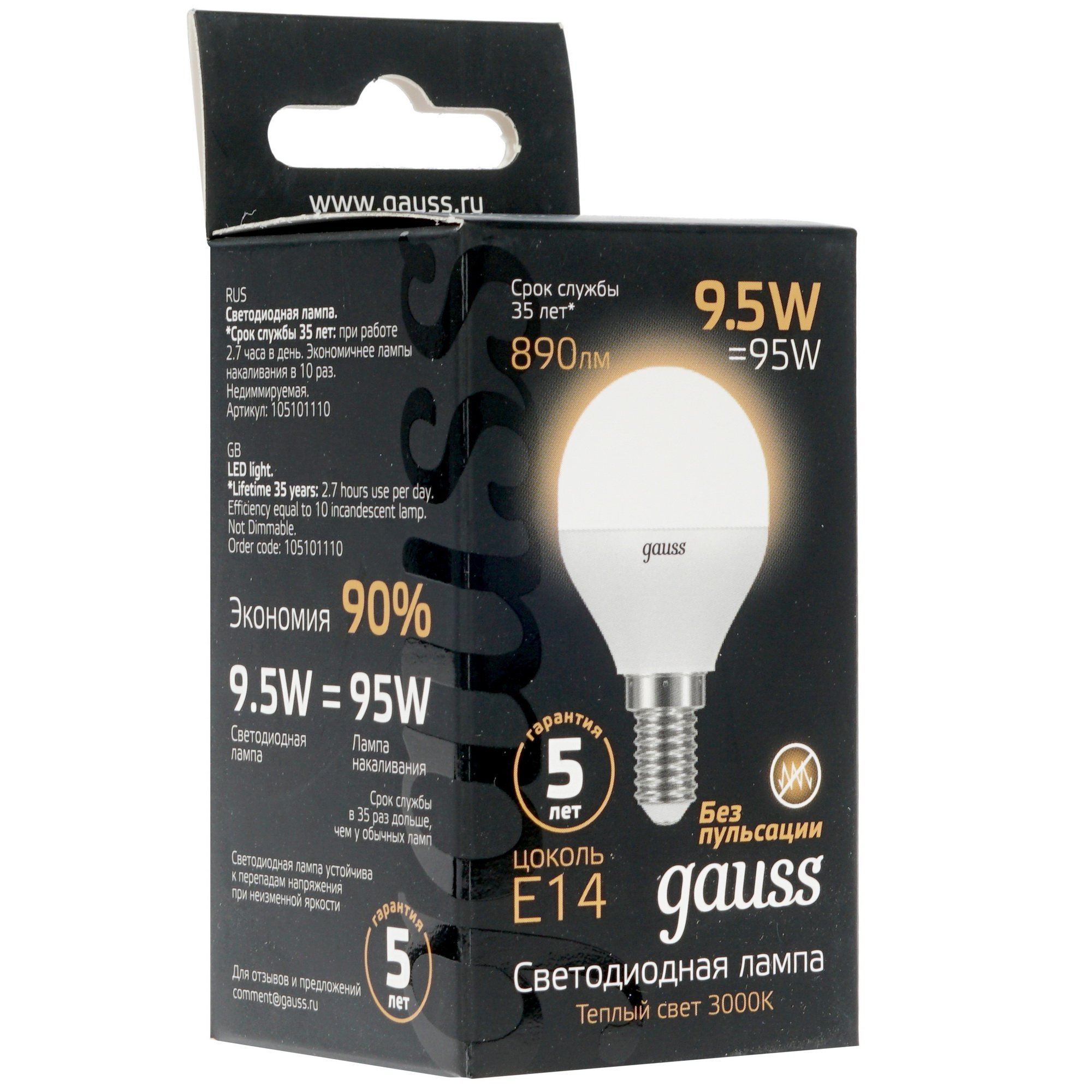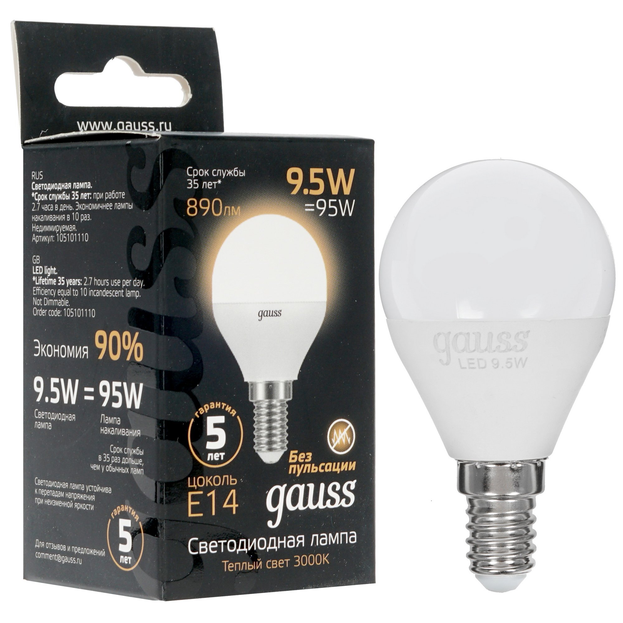 Лампа светодиодная Gauss 9.5Вт цок.:E14 шар 220B 3000K св.свеч.бел.теп. (упак.:10шт)