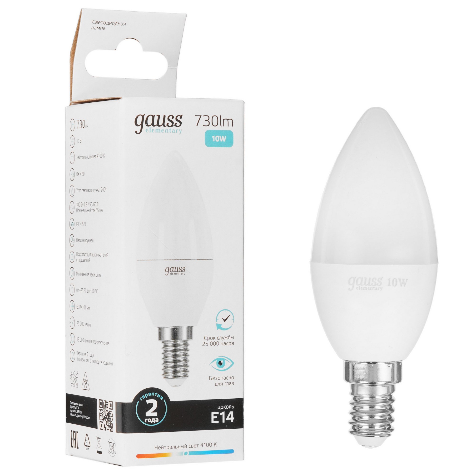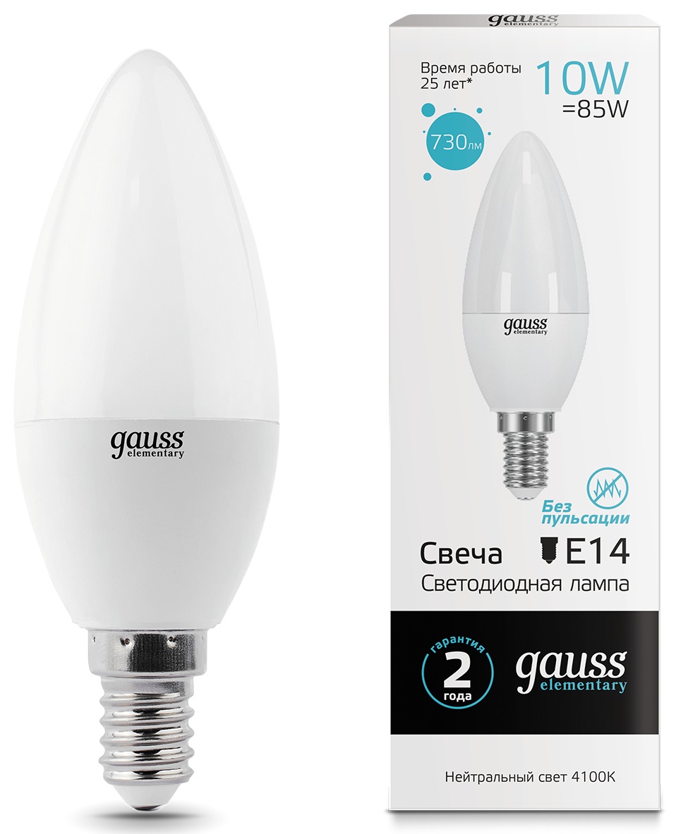 Лампа светодиодная Gauss LED Elementary Candle 33120 с потребляемой мощностью 10 Вт оснащается матовым белым рассеивателем и работает от однофазной бытовой сети. Благодаря минимальному уровню пульсации света лампочка при работе не утомляет глаза пользователя.