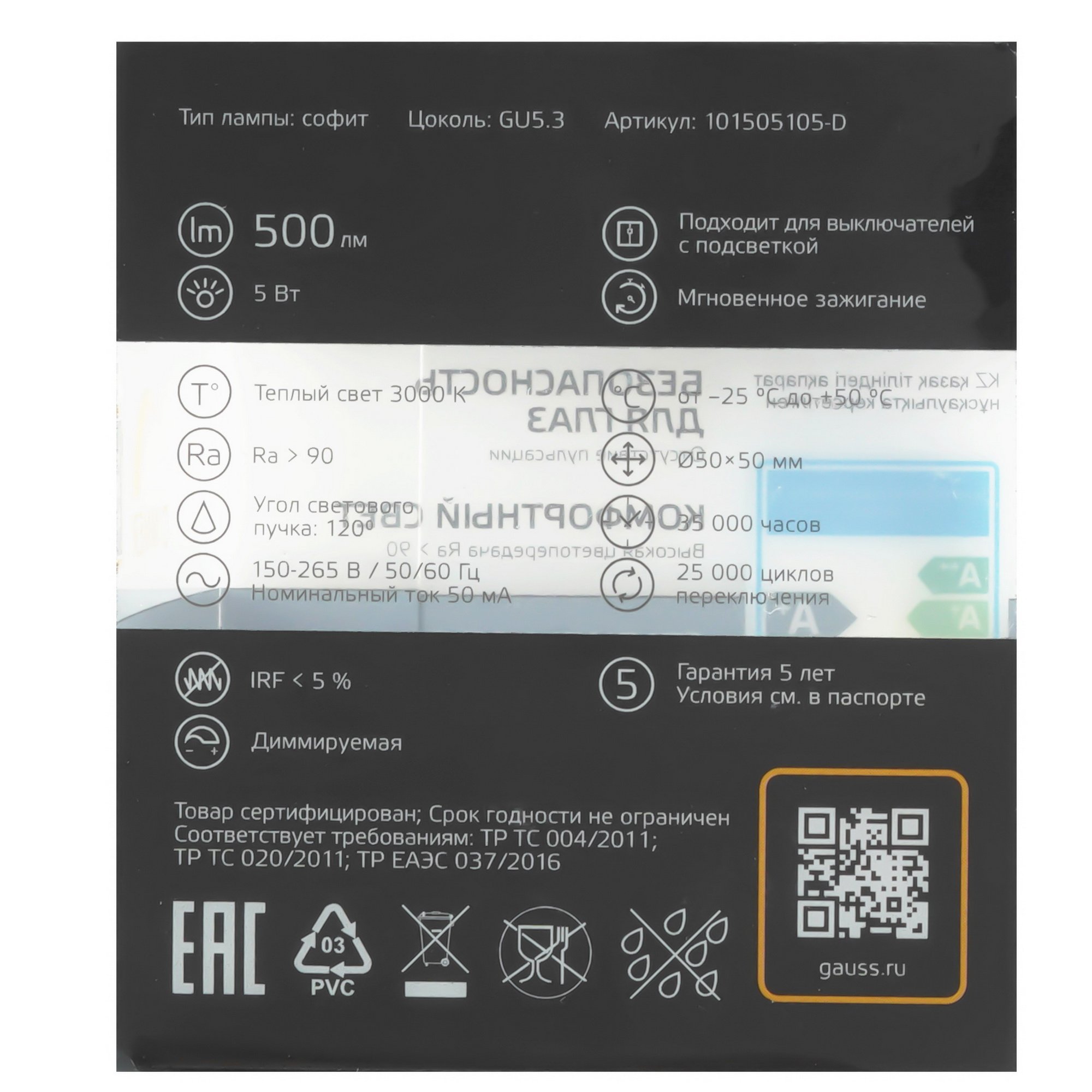 Gauss G9 AC185-265V 5.5W 700lm 4100K с мощностью 5 Вт по яркости не уступает лампе накаливания на 50 Вт. При этом светодиоды выдерживают до 35000 часов работы без замены. LED-лампа с цоколем GU5.3 не мерцает и сохраняет яркость при напряжении в сети 150-265 В. Диммируемая модель поддерживает настройку яркости освещения.