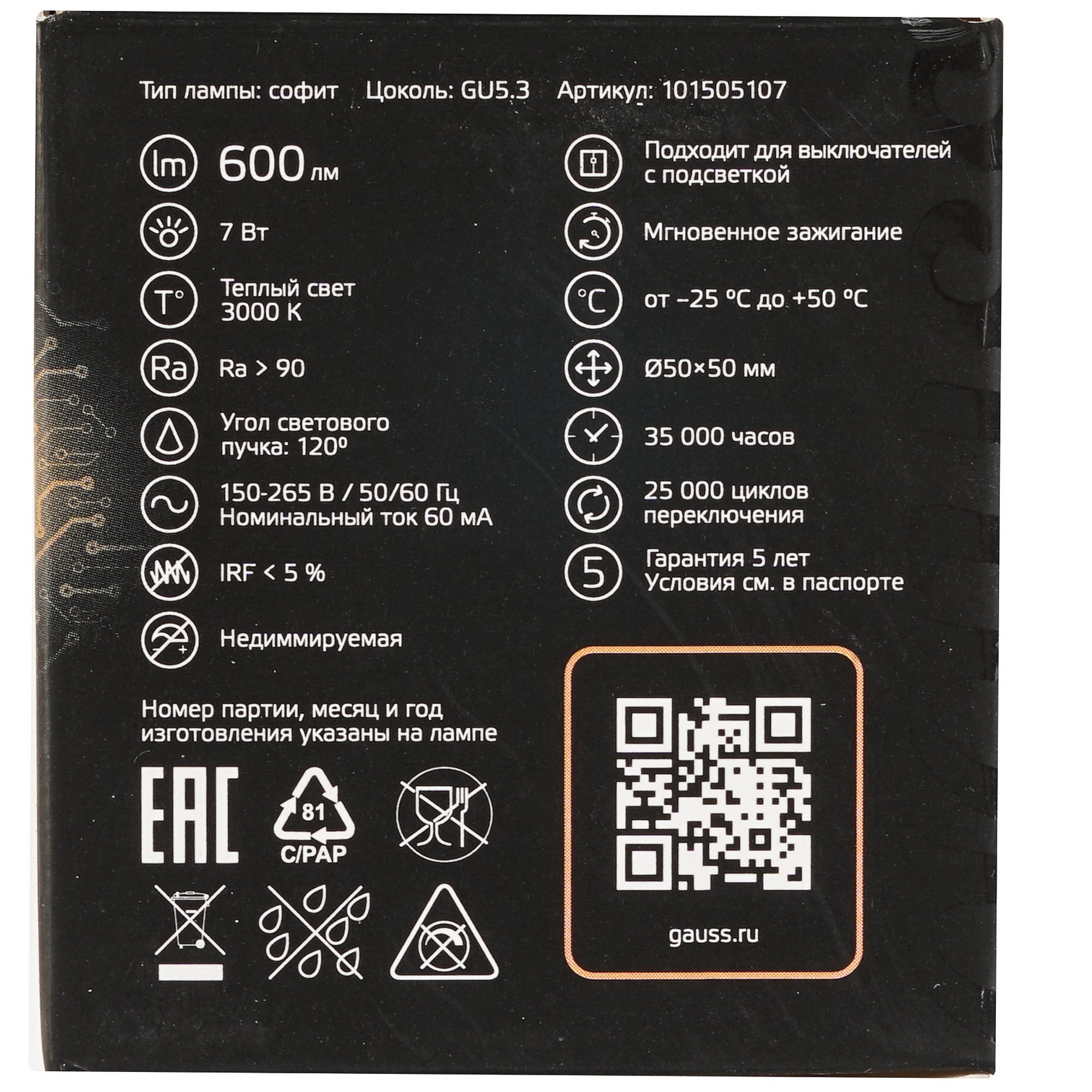 Лампа светодиодная Gauss MR16 7W 600lm 3000K GU5.3 LED 1/10/100 имеет степень защиты IP20 и может размещаться в сухих помещения при температуре от -25°C до +50°C. Белая прозрачная рефлекторная колба изготовлена из пластика и алюминия. Мощность 7 Вт выдает световой поток 600 лм и заменяет лампу накаливания 75 Вт. Теплый белый цвет не слепит и не нагружает зрение. Цоколь GU5.3 монтируется в мебель, натяжные и навесные потолки. Индекс 90 Ra передает точные оттенки цветов окружающих предметов. Gauss MR16 7W 600lm 3000K GU5.3 LED 1/10/100 светит до 35000 ч непрерывно.