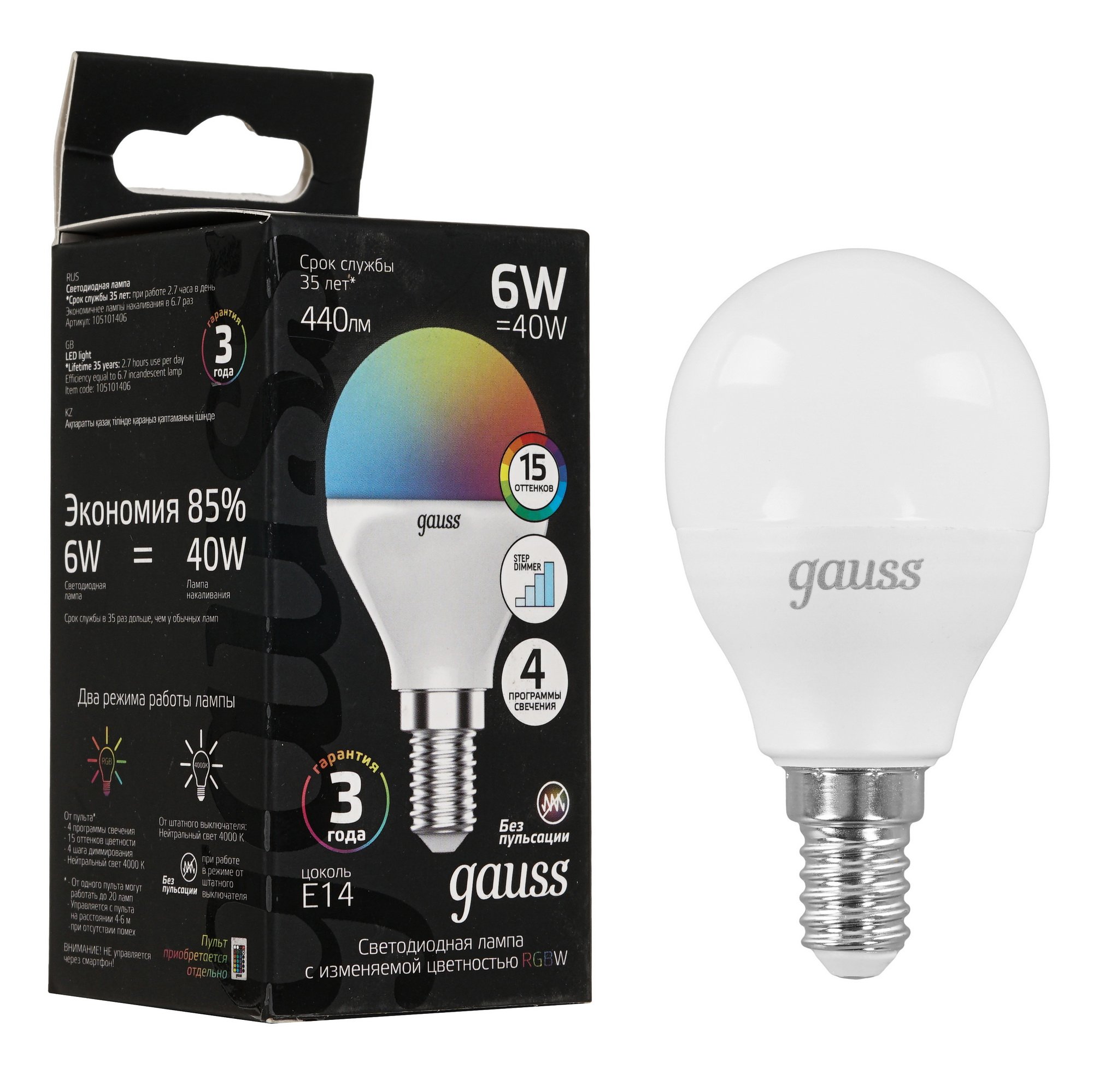 Gauss Шар 6W E14 RGBW с мощностью 6 Вт по яркости не уступает лампе накаливания на 40 Вт. При этом светодиоды выдерживают до 35000 часов работы без замены. LED-лампа с цоколем GU5.3 не мерцает и сохраняет яркость при напряжении в сети 185-265 В.