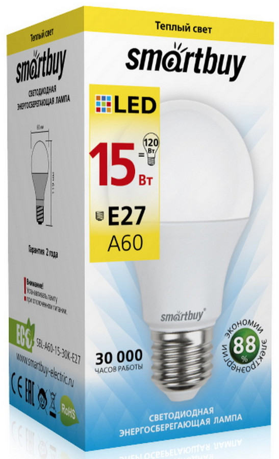 Лампа светодиодная Smartbuy A60-15W/3000/E27 с потребляемой мощностью 15 Вт оснащается матовым белым рассеивателем и работает от однофазной бытовой сети. Благодаря минимальному уровню пульсации света лампочка при работе не утомляет глаза пользователя.