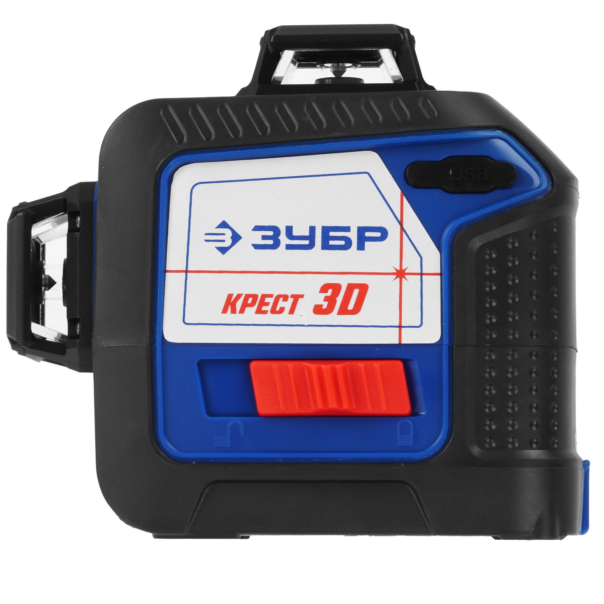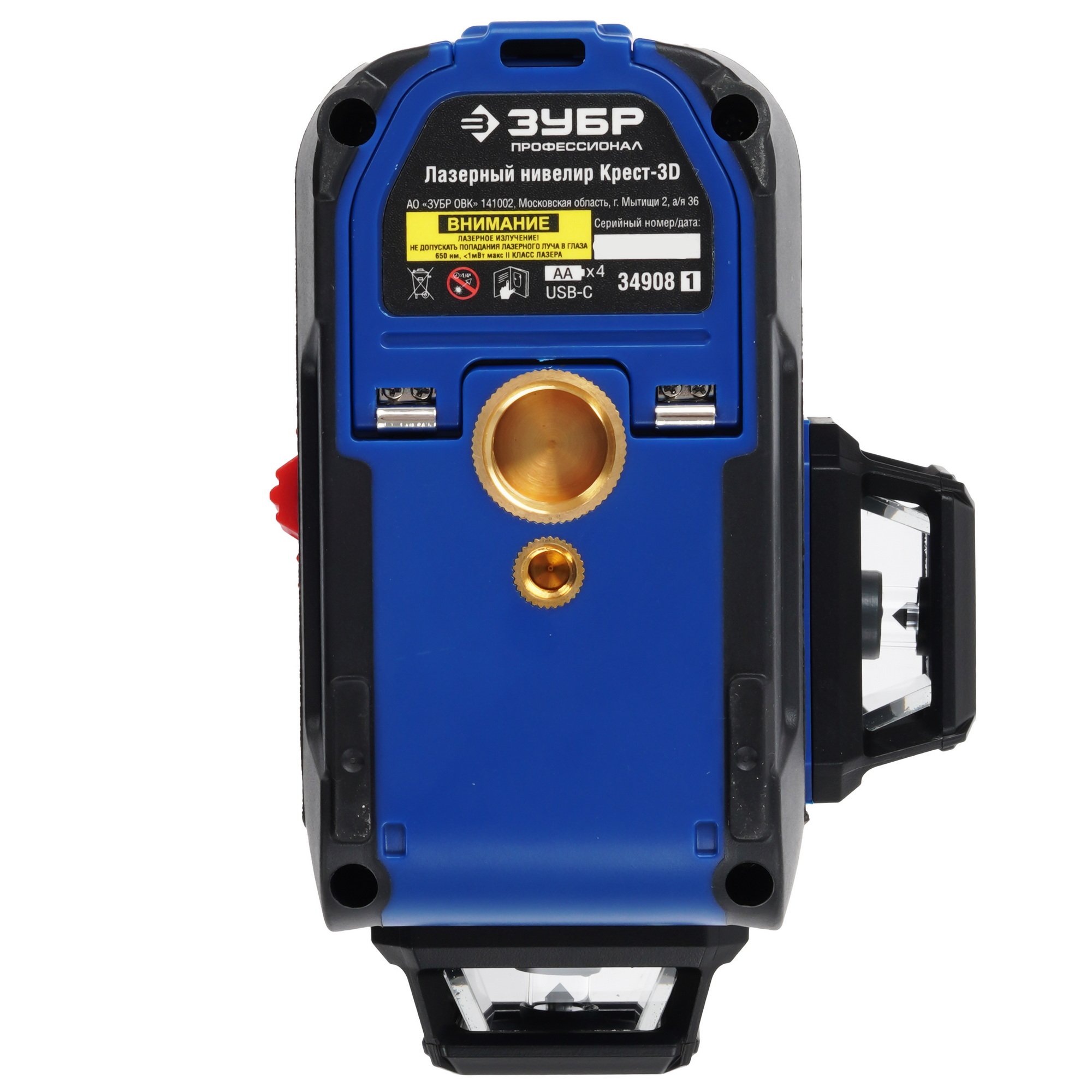 ЗУБР Крест-3D оснащен системой самовыравнивания в диапазоне 4° с индикацией при превышении этого диапазона. Возможность отключения функции позволяет выстраивать произвольные проекции и наклонные линии. Устройство выполнено в защищенном от пыли и брызг корпусе с двумя типами резьбы 1/4" и 5/8" под штатив. Нивелир может работать от сети через разъем USB-C или четырех пальчиковых батареек. Блок питания идет в комплекте.