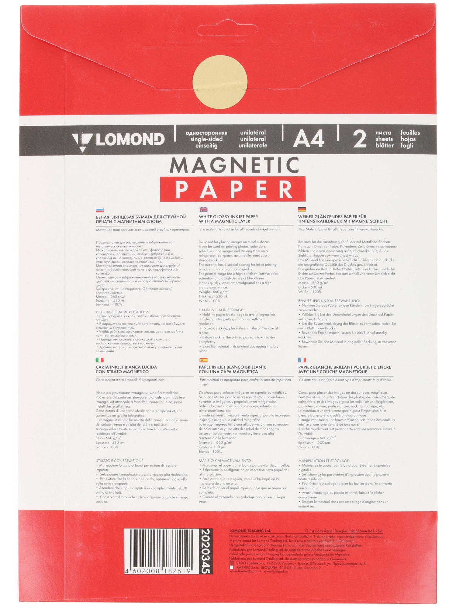Магнитная бумага Lomond Magnetic 2020345 предназначена для печати фотографического качества. В пачке 2 листа формата А4. Чаще всего такая бумага используется для печати магнитов на холодильник.