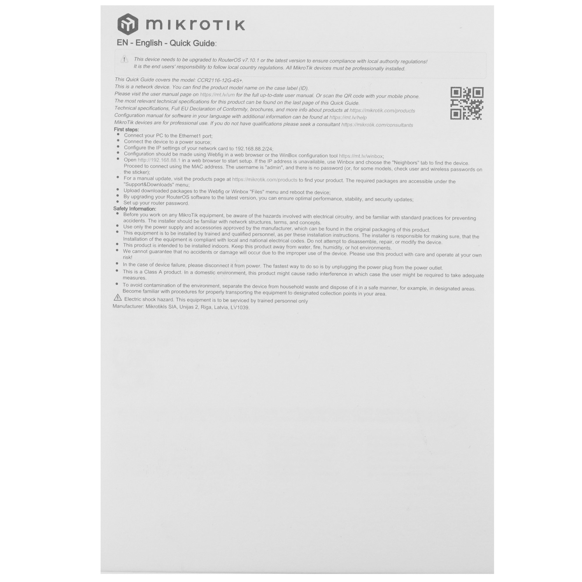 Маршрутизатор Mikrotik CCR2116-12G-4S+ Cloud Core Router 2116-12G-4S+ with Amazon Annapurna Labs Alpine v3 AL73400 CPU (16-cores, 2GHz per core), 16Gb RAM, 4xSFP+ cage, 13xGbit LAN, M.2 PCIe slot, RouterOS L6, 1U rackmount case, Dual PSU