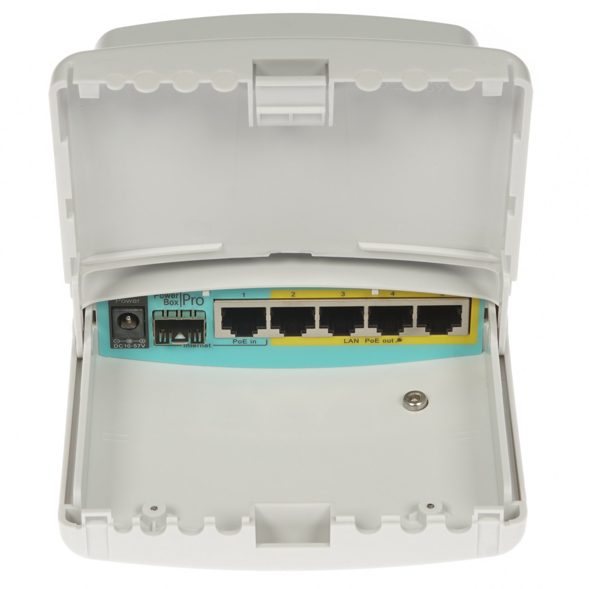 Маршрутизатор Mikrotik PowerBox Pro имеет защищенный от негативных климатических воздействий корпус белого цвета, поэтому разместить его вы сможете как в помещении, так и за его пределами. Он укомплектован 5 гигабитными сетевыми LAN-портами с поддержкой PoE на четырех из них, одним SFP-портом - интерфейсом для подключения к оптической линии. Его межсетевой экран (Firewall) и фильтрация по IP-адресу защитят вашу локальную сеть от разных видов нежелательной активности - вредоносного ПО, DDOS-атак.