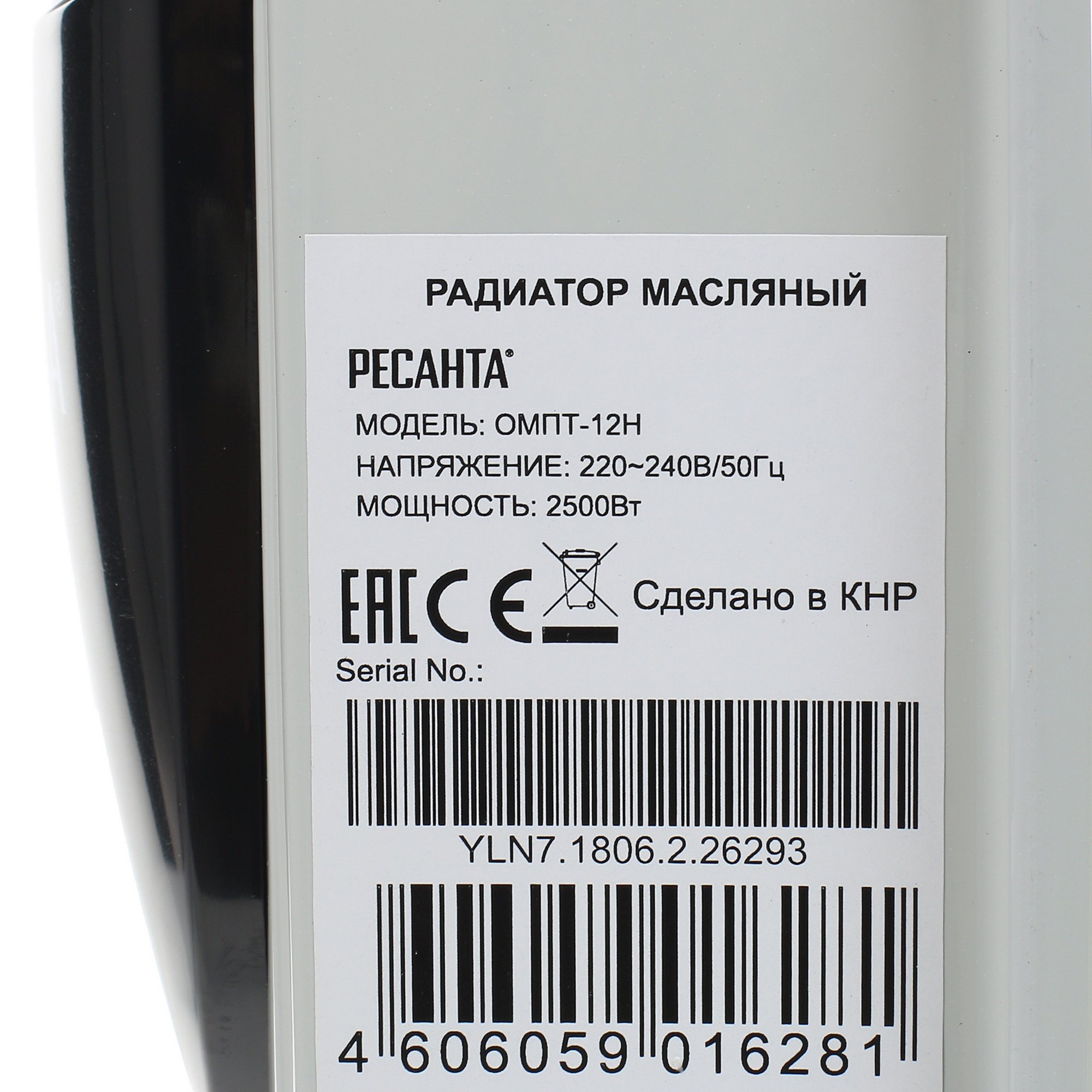 Обогреватель масляный Ресанта ОМПТ-12Н (12 секций) белый, 2500 Вт, 25 м2, термостат 67/3/5