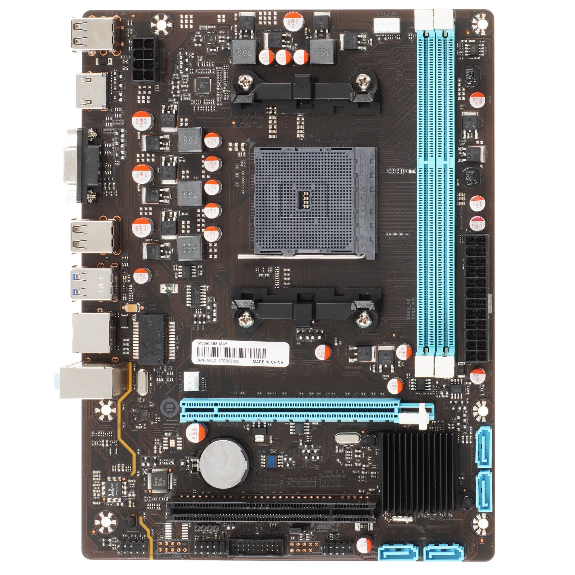 Материнская плата AFOX A88-MA5 обеспечивает создание надежной платформы в составе домашнего или офисного ПК. Компактные габариты делают ее подходящей для интеграции в условиях ограниченного пространства. Плата поддерживает процессоры AMD с мощностью не более 95 Вт (сокет FM2/FM2+). Модель оснащена 2 слотами DIMM под установку оперативной памяти поколения DDR3, 1 слотом расширения PCI-E x16, 4 слотами SATA для устройств хранения. Из характеристик – 5.1-канальный аудиокодек и сетевой коннектор LAN со скоростью до 100 Мбит/с. Надежные компоненты гарантируют стабильность и отказоустойчивость платы AFOX A88-MA5.