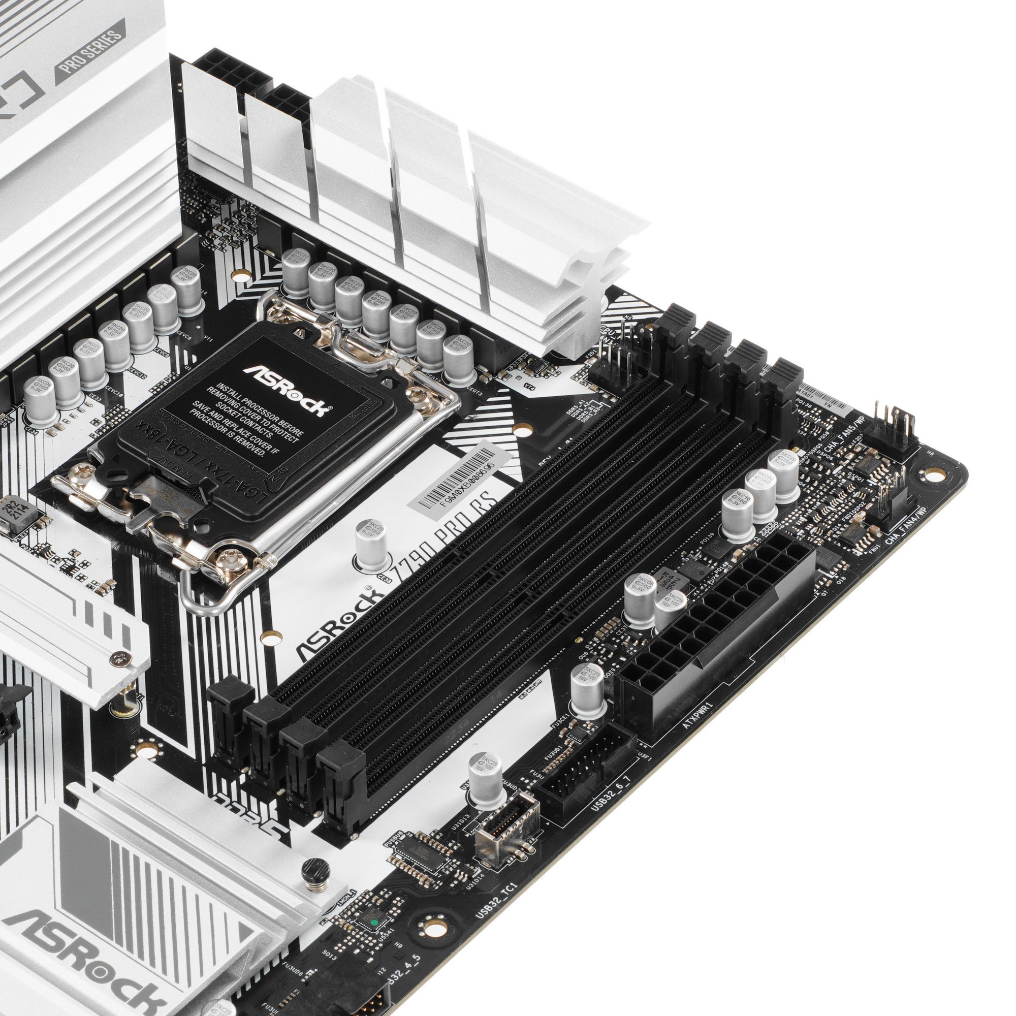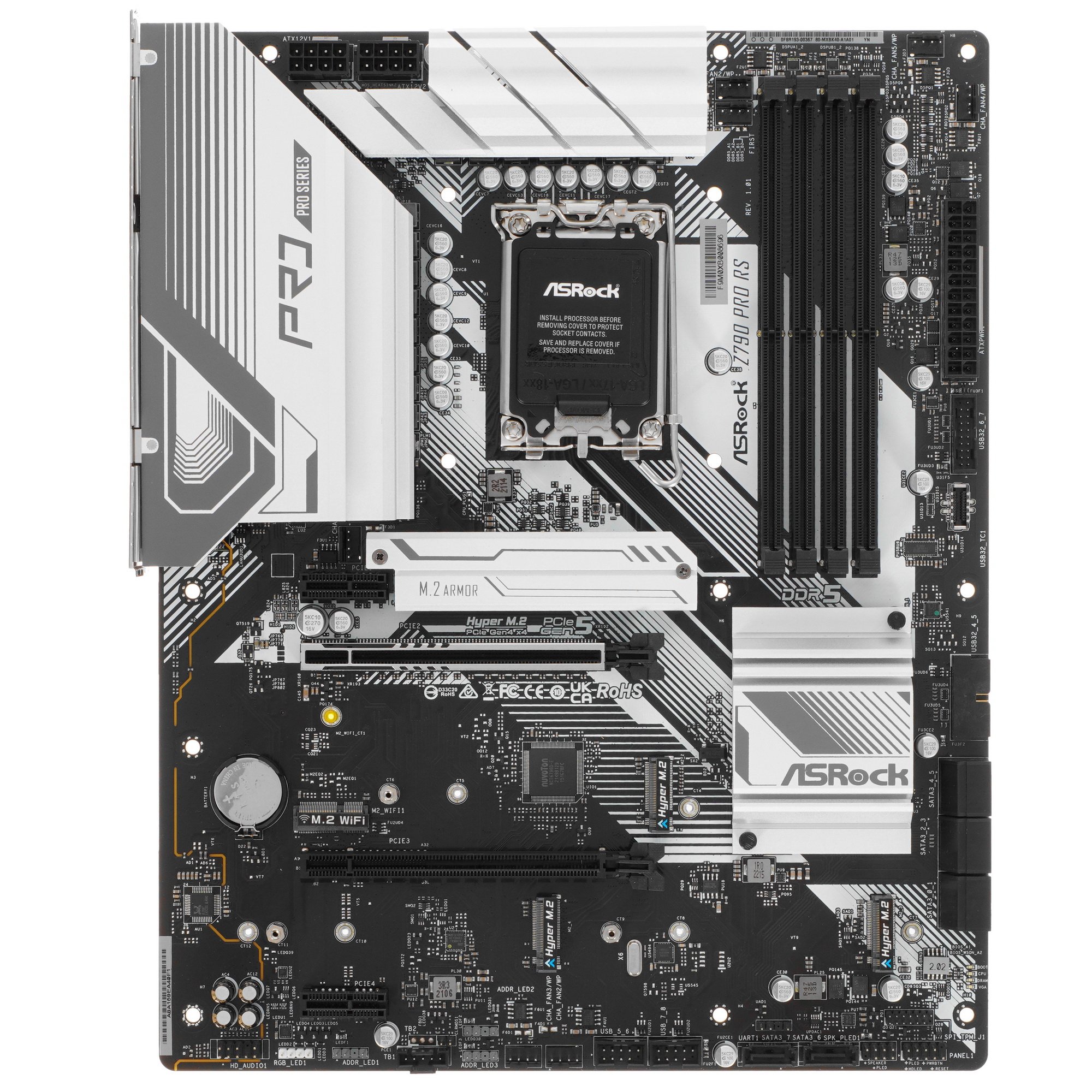 Материнская плата ASRock Z790 Pro RS – это оригинальный стиль и технологичность высокого уровня. Она создана для геймеров и моддеров. Внешне модель привлекает внимание крупными серебристыми радиаторами охлаждения и программируемой подсветкой RGB с широкими возможностями персонализации. Плата оборудована 4 слотами под установку максимум 256 ГБ оперативной памяти стандарта DDR5 частотой до 7200 МГц, 2 слотами расширения PCI-E x16 для графического адаптера, 4 разъемами M.2 и 8 слотами SATA для накопителей. ASRock Z790 Pro RS оснащена сетевым адаптером со скоростью 2.5 Гбит/с. С боковой стороны предусмотрены проводные интерфейсы: USB стандарта Type-A и Type-C, HDMI, DisplayPort, LAN, аудио.